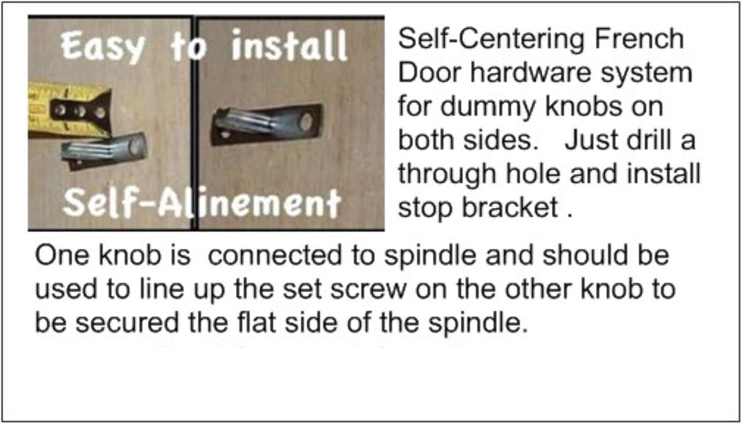 Contains all the hardware for knobs on both sides of two French Doors: four Depression Crystal Glass Knobs are 2" in diameter Four Solid Glass Door Knobs in Sturdy Base Four 2-1/2 inch Backplate Rosettes Custom set screws for a no wiggle fit when secured to the flat side of the spindle Matching wood screws Our exclusive self-aligning hardware system allows you to line up both sides perfectly and is much stronger than the old surface mount brackets. Simple to install (see image): 1. Drill 1/4" Through hole 2-3/8" backset, 36" from floor. 2. Install one included stop bracket and tap for equal length of spindle on both sides 3. Install the other side and then install the backplates and knobs. Full Instructions will be included with your order.