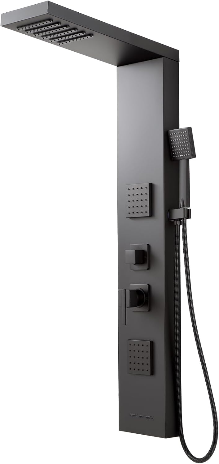 Understanding Your Shower Panel – Professional Installation Guide ① Plumbing Connection: The shower panel includes pre-installed 1/2" hot and cold supply hoses, directly attached to the integrated mixing valve. Connect these hoses directly to standard 1/2" NPT water supply fittings in the wall. ② Integrated Mixing Valve: Built-in mixing valve controls water temperature internally. This panel cannot be used with existing shower valves or trim kits; removal of prior rough-in valves and associated plumbing is required before installation. ③ Mounting Procedure: Secure mounting brackets to the wall by drilling into tile or solid backing. Hang the panel securely onto these brackets, ensuring alignment and stability. Product Dimensions (for Rough-in Preparation) ① Height: 46.5” (base to top edge) ② Width: 7.8” (side-to-side dimension) ③ Depth: 19.5” (wall to the furthest point on the panel) Core Functional Specifications ① LED Lighting: Operated by two AA batteries; activate via side-mounted red button. ② Rainfall Shower: High-pressure overhead stream for robust rinsing. ③ Mist Shower: Atomized spray delivers a fine mist experience. ④ Body Jets: Front-mounted jets deliver pressurized streams for targeted hydro-massage. ⑤ Handheld Wand: Intensive spray, suitable for cleaning tasks, personal bathing, or washing pets. ⑥ Tub Spout: Integrated waterfall-style spout for rapid filling. ⑦ Maintenance-Friendly Nozzles: Anti-clog rubber nozzles simplify removal of mineral buildup. After-Sales Technical Support ① Lifetime technical support included. ② Complimentary replacement parts provided for confirmed quality issues. ③ Technical inquiries addressed within 12 hours via Amazon seller messaging.