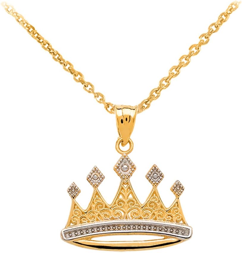 With its detailed and artistic design, this handcrafted 14k two-tone Gold Crown Necklace was polished to perfection by our best jewelry makers. Crowns are a symbol of royalty, elegance and authority. Whether you're a simple school girl, a hardworking mom, or just a woman who dreams of becoming a princess, wear this sophisticated Gold Crown Necklace to accent your style and empower yourself as a woman.Pendant Information:Pendant height with bail: 0.90 inchesWidth at widest point: 0.85 inchesDepth: 0.05 inches