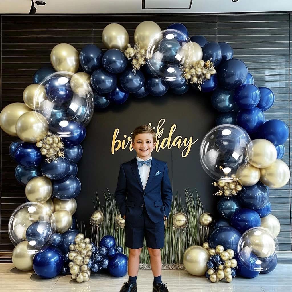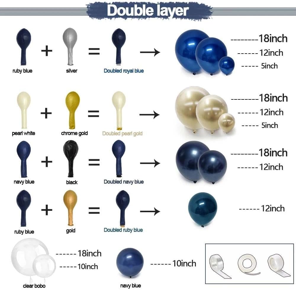 How to make a blue gold bobo balloon garland? Step 1: Blow up double stuffed balloon garland kit with a balloon pump then tie knots(tie inside one), Pull the knot of the balloon through the big hole in the balloon chain, then pull it into the small hole next to big hole and snap it. Step 2: Randomly combine different size balloons and colors with balloon chain .Measure and cut the balloon chain to the desired length,leaving extra on each end for hanging the decoration with balloon strip later. Step 3: Use balloon glue dots to glue some remaining balloons to the already made yellow balloon arch to make the balloon shape more layered and catch eyes. Step 4: Make it more gorgeous looking, add some eucalyptus, curling ribbon, flowers, leaves, tulle, or more.
