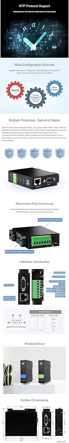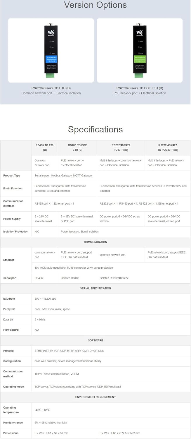 Features It is a RS232/485/422 device data acquisitor / IoT gateway designed for industrial environment. It combines multi functions in one, including serial server, Modbus gateway, MQTT gateway, RS485 to JSON, etc. The module features RS232/485/422 and Ethernet port (PoE function optional), uses DC port (outer diameter: 5.5mm, inner diameter: 21mm) and screw terminals for power input. The case with rail-mount support, small in size, easy to install, cost-effective. It is suitable for applications like data acquisition, IoT gateway, safety & security IoT, and intelligent instrument monitoring... Package include Note: The power supply of this product is not included, it is recommended to used with a 12V Industrial DIN-Rail Power Supply 1. RS232/485/422 TO ETH (B) x1