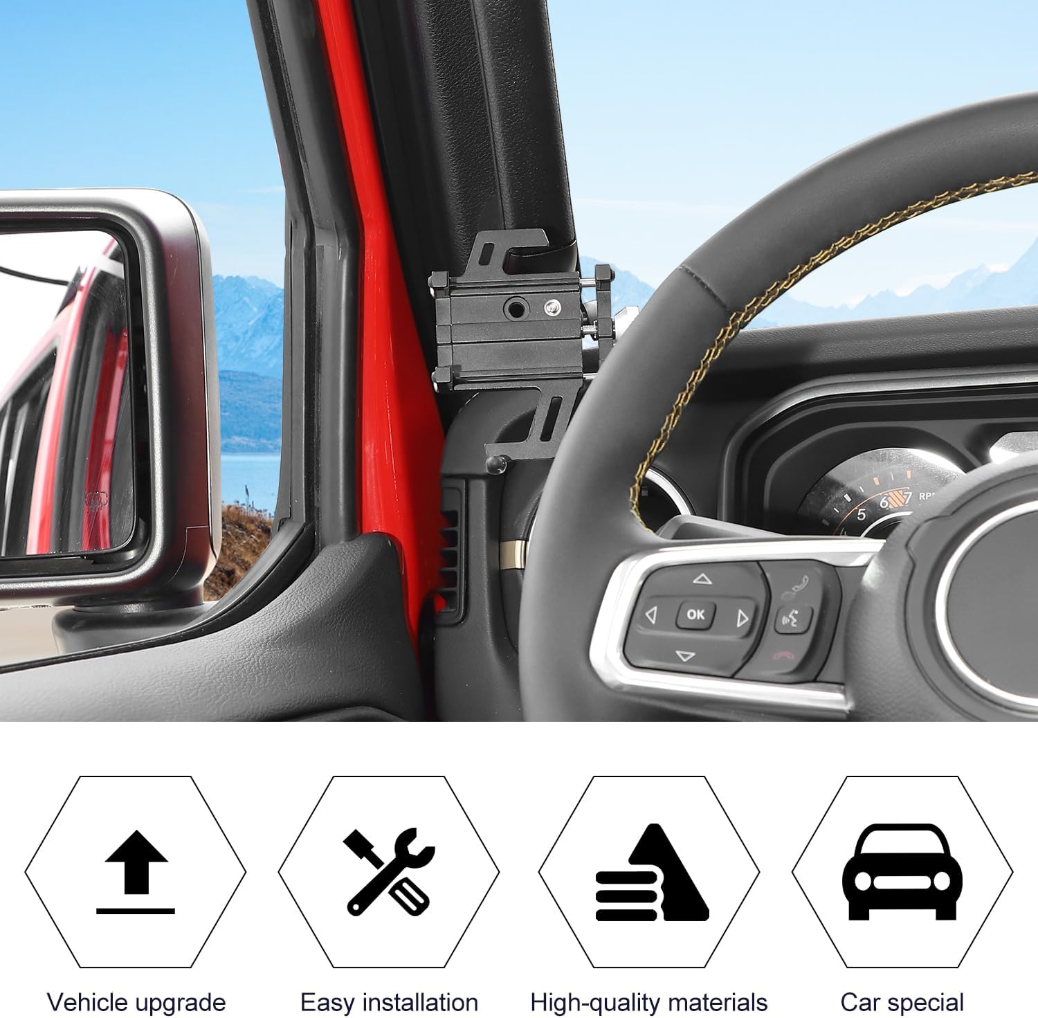 A-Pillar Phone Holder Compatible with Jeep Wrangler JL JLU & Gladiator JT 2024Features:Strong and durable for heavy duty workWithout fading and rustingSuper stability for your cellphoneEasy installationPackage Included:1 * Phone Holder