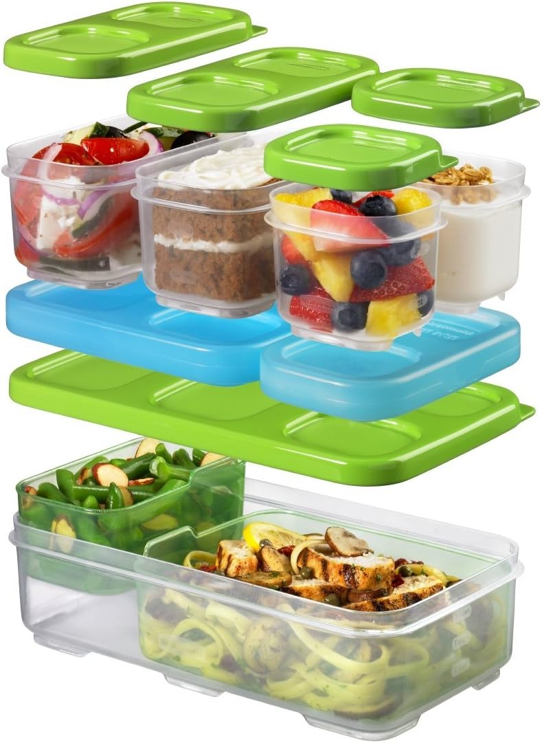 The Rubbermaid LunchBlox Entrée Kit is designed to make taking lunch to school or work easier, more convenient and more organized. The entrée lunch container is large enough to bring a full size sandwich plus a side item, and includes removable dividers to keep foods separate. The kit comes with two side item containers perfect for small side salads and desserts along with two small sauce containers to complete your dining experience. All lunch box containers can be snapped together around Blue Ice freezer packs to keep food cool for up to four hours. Designed to work together to save space, the kit will stay organized in any lunch bag. All BPA-free LunchBlox containers are leak-proof, microwave-, dishwasher-, and freezer-safe. It is a wonderful way to take food on the go and can go to parties, picnics or cookouts or use to fill with treats and share with friends. The Rubbermaid LunchBlox Entree Food Containers also make a wonderful gift for you or any new homeowner to keep food organized and fresh so can simply reheat and eat. Fits perfectly inside LunchBlox Medium lunch bags. Includes 1 Entrée Kit with 2 divider inserts (4.1 cup, 4.81" L x 8.625" W x 2.25"), 2 Snack Containers (.5 cup, 2.33" L x 2.73" W x 2.23" H,) 2 Side Containers (1.2 cup, 2.76" L x 4.84" W x 2.23" H), 1 Medium Blue Ice freezer pack (5.55" L x 4.71" W x 0.78" H) and 1 Small Blue Ice freezer pack (2.77" L x 4.71" W x 0.78" H).
