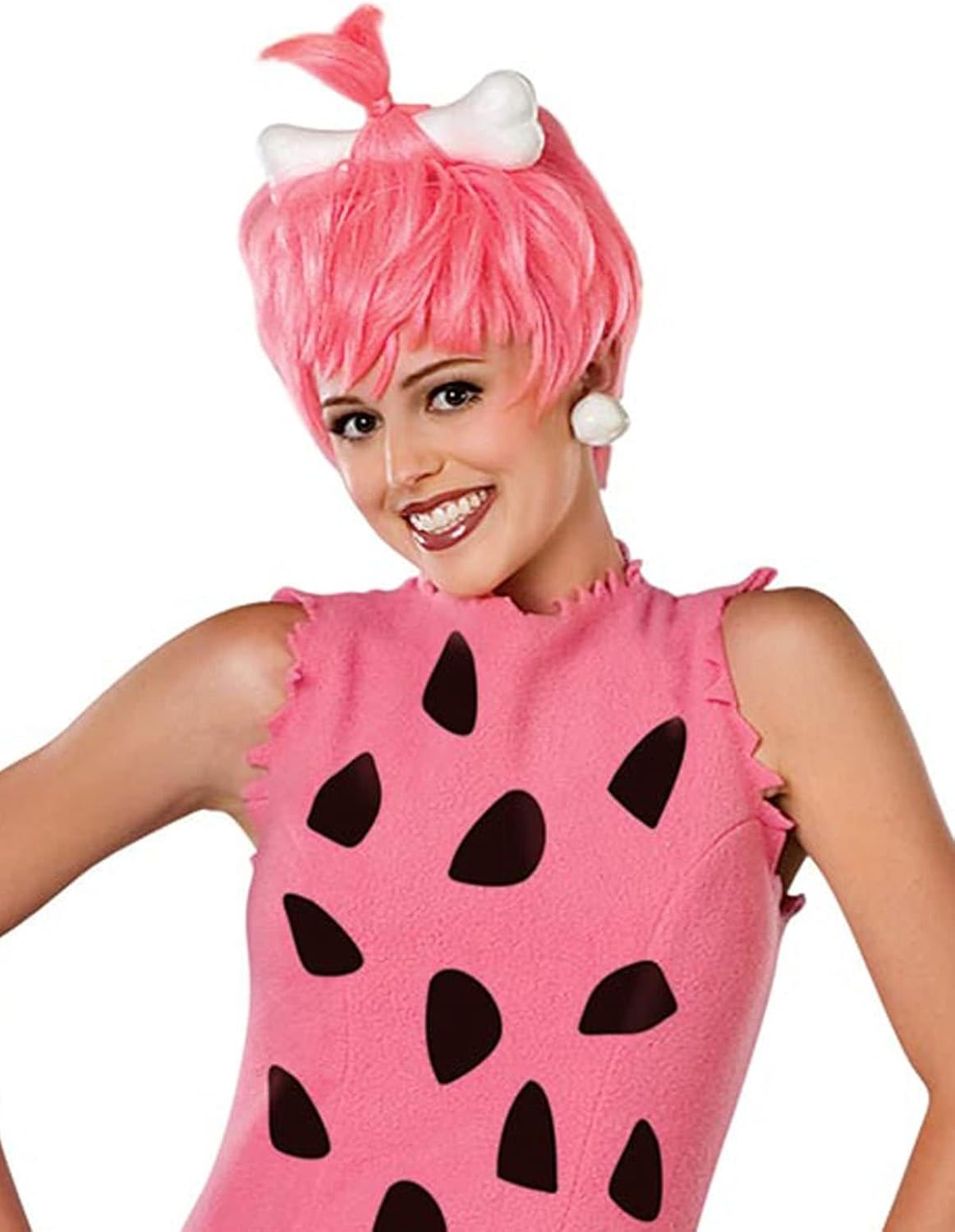 WOW! Pebbles has never looked so good! This cute costume includes the shirt, shorts, wig with bone and leg warmers.