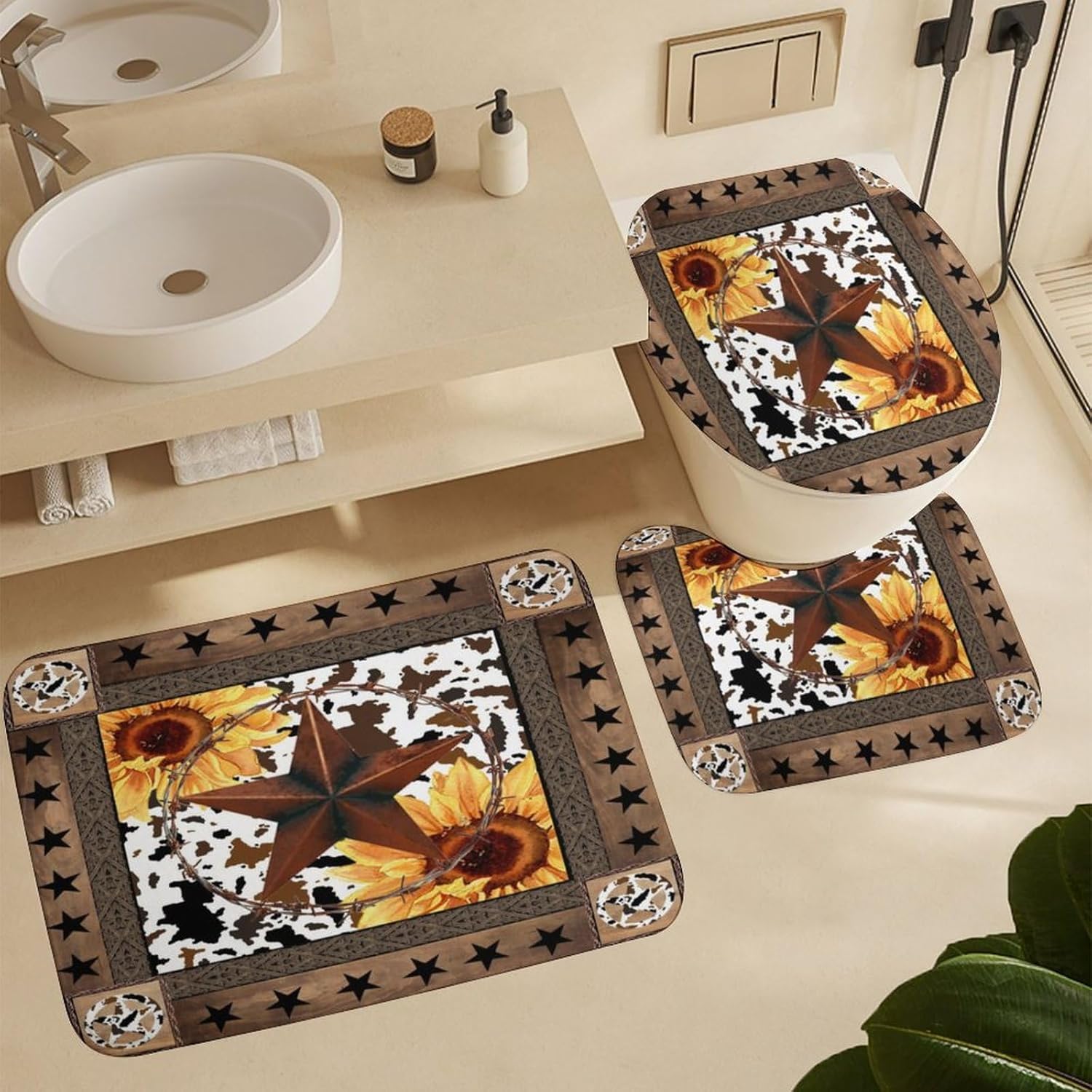 JretailAx Rustic Cow Skin Print Patterned 4 Piece Shower Curtain SetsThis Rustic Cow Skin Print Shower Curtain Sets 4 Piece liven up your indoor or outdoor spaces with a sense of airiness and beauty.Workmanship & Design:Each Bathroom Sets is machine-made and neatly sewn with no loose threads. Soft,high-quality fabrics ensure long-lasting durability.Beautiful patterns,clever colour matching and advanced printing and dyeing processes for vibrant,fade-free colours.This Vintage Western Cowboy Wooden Board Texas Star Sunflowers Bathroom Sets is suitable for: living rooms,bedrooms,boys' rooms,girls' rooms,nurseries,dining rooms,offices,dormitories,window sills,etc.Care instructions.Machine wash in cold water or hand wash,do not bleach,iron at low temperature.Customer service.24 Hours customer support.