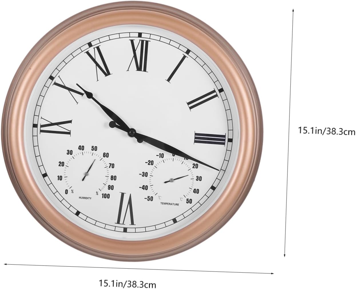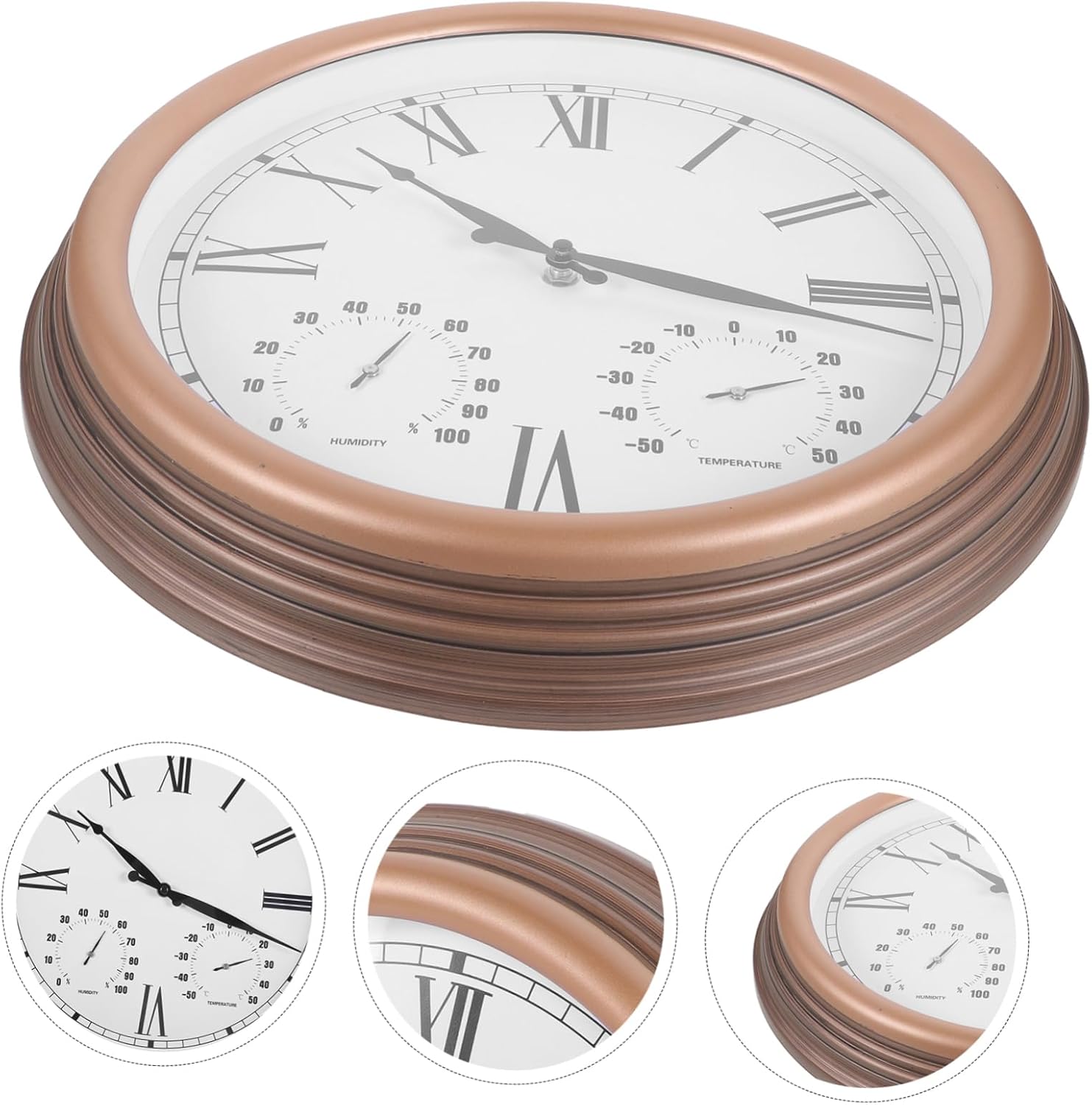 Package Include 1 x outdoor wall clock Features -Size:38.30X38.30X5.30cm/15.05X15.05X2.08in outside clocks -Protection Grade: IP44 clock for walls -Material:Plastic, glass, PVC patio clock -Color:Assorted Color outdoor thermometers - Easy to install in a variety of settings, including gardens and patio, providing added comfort and convenience hanging clock. - Our outdoor wall clock is weather resistant and sturdy, this clock is the perfect addition to any outdoor decor scheme garden clock. - Features a Roman numeral display that is easy to read, providing clear time, temperature, and humidity readings outdoor clock with thermometer. - The clock displays the time in easy-to-read numbers, while the thermometer and hygrometer accurately measure the temperature and humidity. outdoor clock - Outside wall hanging clock is designed to simple use, adding a touch of style and sophistication to your home decor outside clock.Goods Informationoutside clock Mainly made from plastic, glass and PVC material, outdoor wall clock is sturdy yet portable, suitable for lasting use.unique clocks Whether you're lounging on your porch, grilling in your backyard, or entertaining guests on your patio, this thermometer hygrometer clock keeps you of both the time and the temperature