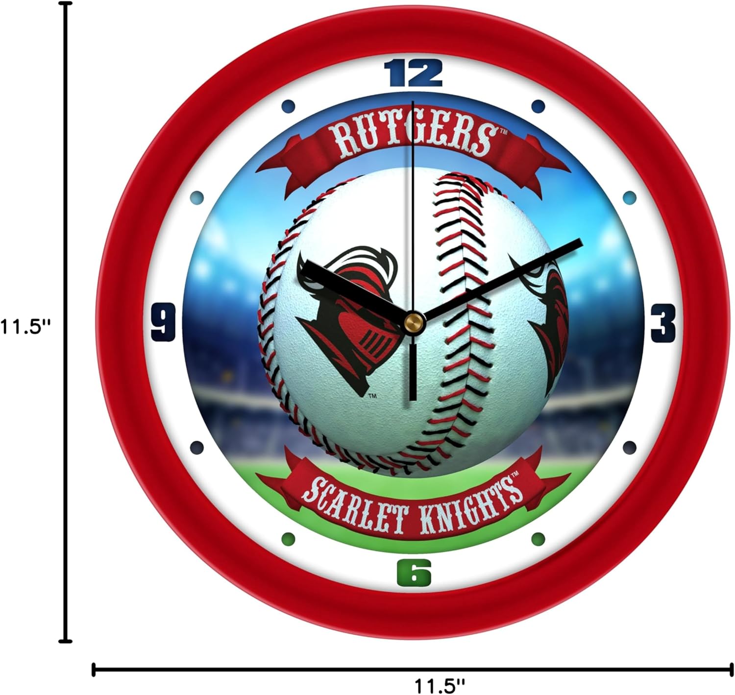 Home Run Wall Clock by Suntime Demonstrate your team spirit in your home or office with your favorite college logo. These 11.5 inch Home Run Wall Clocks feature a battery-powered (1xAA battery not included) quartz accurate movement. Unlike plastic wall clocks, you experience superior visibility with our mineral glass crystal. The printed ring on the crystal displays the numbers with a school color-coordinated outer bezel. Clock Measures: 11.5" x 11.5"