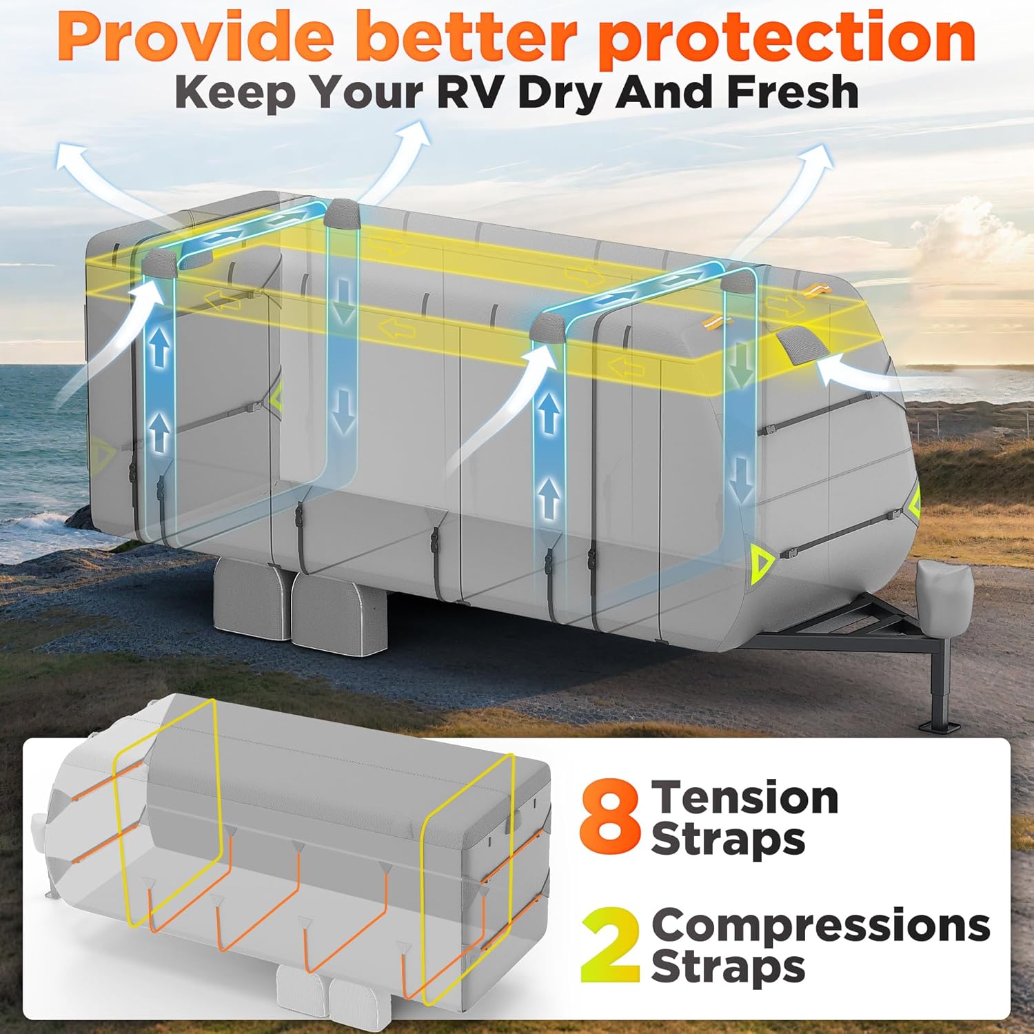 • [Ventilation and Visibility]: There are 4 vents on both sides and a total of 2 vents in the front and rear to reduce wind pressure, while the rollable zipper door on one side allows ready access to the RV door and engine area for easy viewing and inspection of the interior. There are 4 reflective strips at the front and back to avoid collisions at night, and breathable material maximizes moisture evaporation under the lid for longer life.