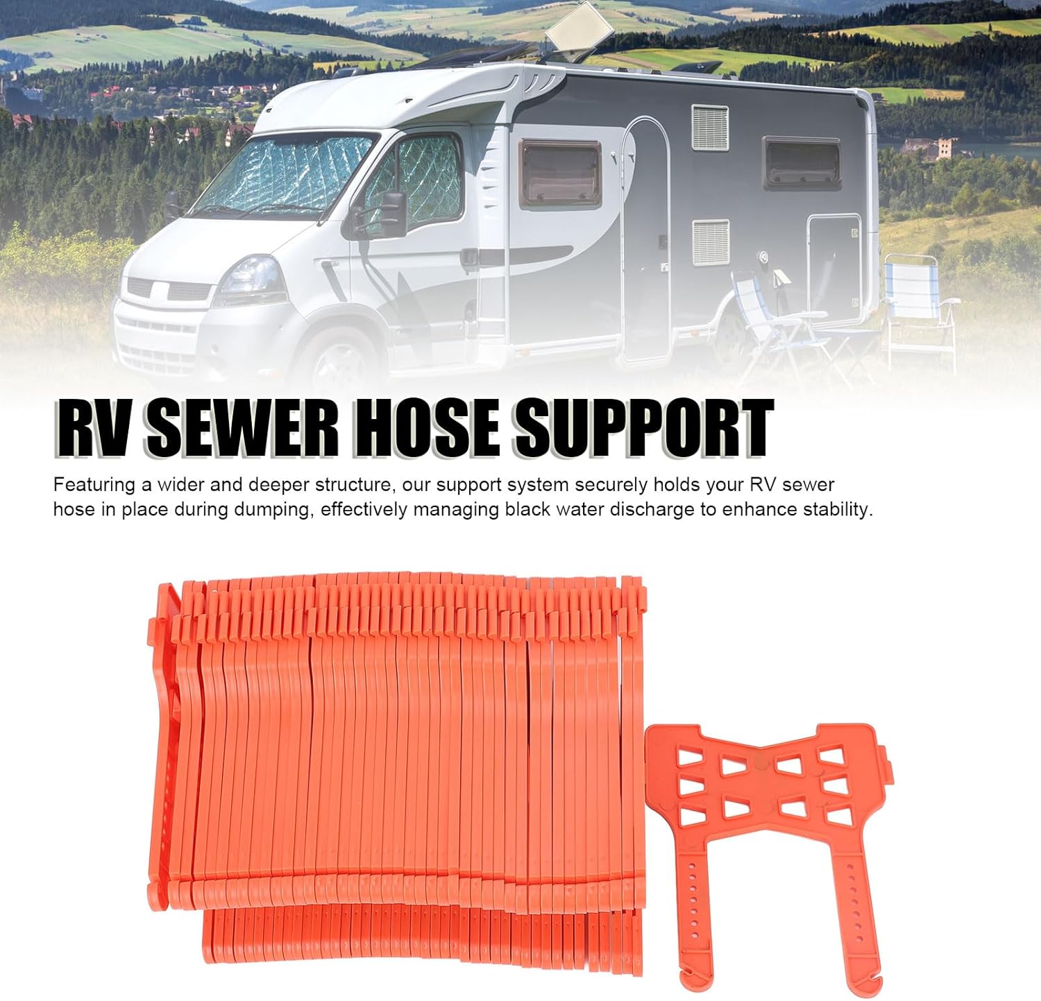Spec: Item Type: RV Sewer Hose Support Material: ABS Color: Orange Weight: Approx. 3589.00g / 126.6oz PackageList: 1 x RV Sewer Hose Support Kit (44pcs)