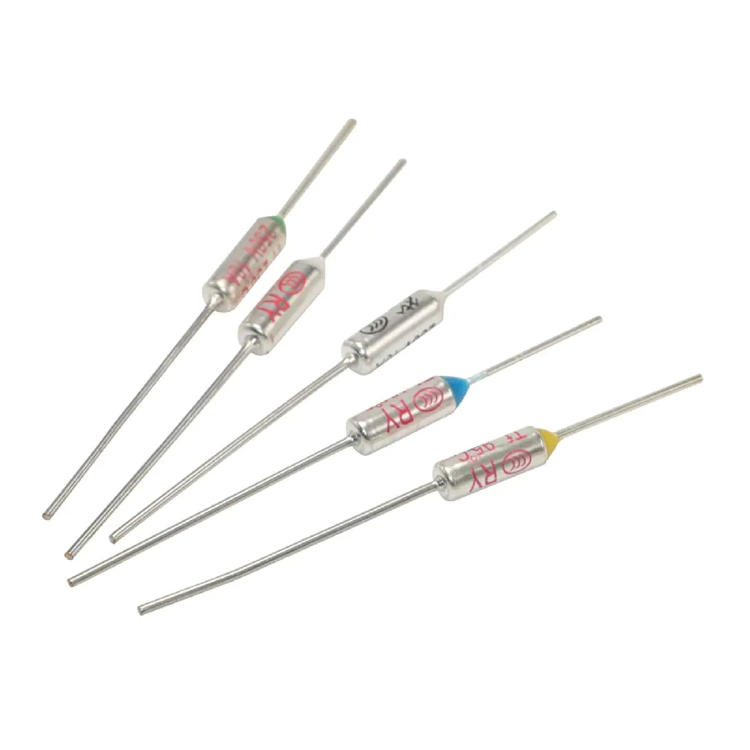 These RY series thermal fuses are essential safety components designed for precise temperature control and circuit protection. Available in a comprehensive range of temperature ratings from 60°C to 280°C (140°F to 536°F), these thermal cutoff devices offer versatile solutions for various applications. With their robust current handling capacity of up to 15A at 250V, they provide reliable protection against overheating in electrical circuits. The compact TF-type design ensures easy installation and efficient use of space in your equipment. These thermal fuses function as one-time protection devices, automatically interrupting the circuit when the preset temperature is exceeded, making them ideal for preventing potential thermal damage. Each fuse is precisely calibrated to its rated temperature, offering consistent and dependable performance. Available in convenient pack sizes of 10 or 100 pieces, these thermal fuses are perfect for both small-scale projects and industrial applications. The silver-colored cylindrical body with color-coded markers makes identification straightforward, while the extended leads allow for flexible mounting options.