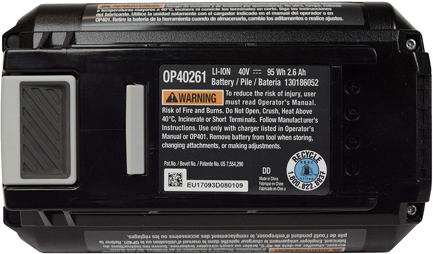The Ryobi 40-Volt Lithium-Ion Battery Starter Kit includes a compact 2.6 Ah battery and rapid charger compatible with Ryobi 40-volt outdoor tools.