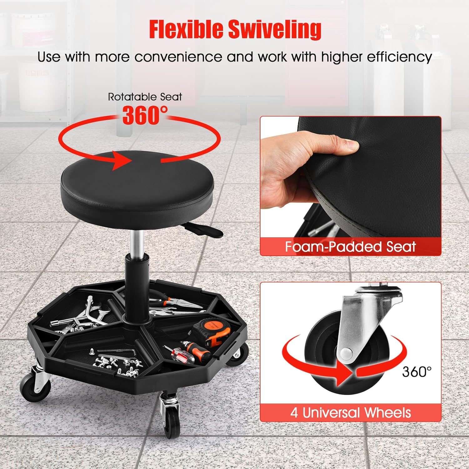 Description:Are you tired of bending down to repair your beloved car? Or are you always hard to find out the wanted tools? This rolling creeper stool will be a perfect solution.With 16"-22" adjustable height, 360° swiveling seat and universal wheels, the rolling stool can satisfy your different demands for daily repairing and highly improve the working efficiency. And the seat is foam-padded for more comfort. The rolling stool is also of super high stability with the SGS certificated pneumatic rod. Apart from that, the bottom storage tray offers ample storage space for all kinds of tools, offering much convenience to you. Come to own this functional working partner!Features:Use the auto raise lever to adjust the seat height from 16" to 22"SGS certificated pneumatic rod for high stability360° rotatable seat and 4 universal wheels for high flexibilityBottom tool storage tray allows you to fetch tools easilyOne quarter of tool tray is magneticSuitable to repair shop, garage, warehouse and so onEasy to assemble with the detailed user guideWaterproof leather seat is much simpler to cleanSpecifications:Color: Red/Black/YellowMaterial: Metal, Faux Leather, Pearl Cotton, PVC, PP, ABSOverall Dimension: 20" x 20" x 16" - 22" (L x W x H)Size of Seat: 12" x 2" (Dia x Thickness)Net Weight: 11 lbsWeight Capacity: 330 lbsPackage Includes:1 x Rolling Mechanic Stool1 x Instruction