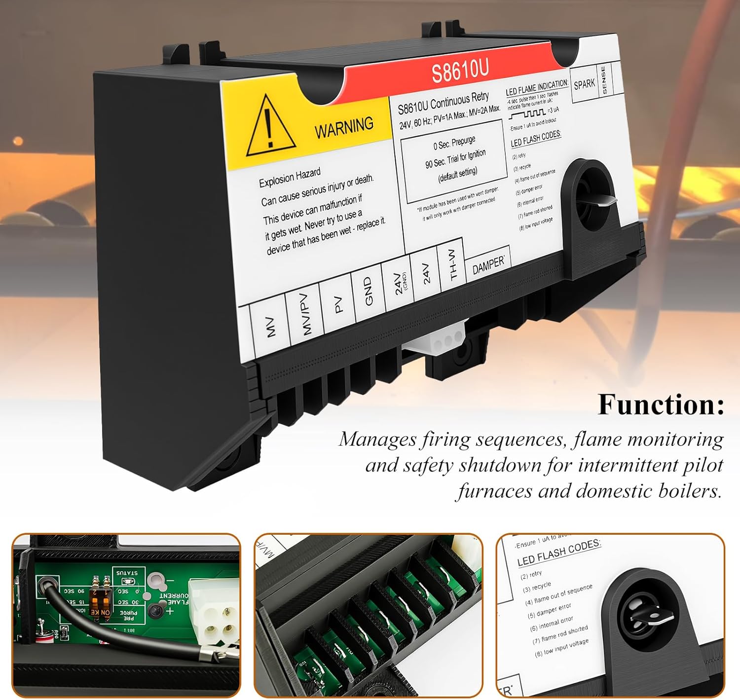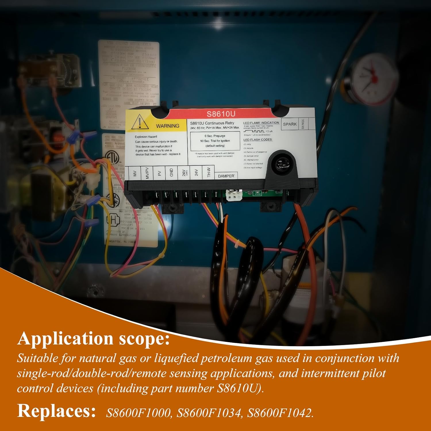Application scope: Suitable for natural gas or liquefied petroleum gas used in conjunction with single-rod, double-rod, remote sensing applications, and intermittent pilot control devices (including part number S8610U). Replaces: S8600F1000, S8600F1034, S8600F1042. Function: Manages firing sequences, flame monitoring and safety shutdown for intermittent pilot furnaces and domestic boilers. Note: Not for standing pilot systems, direct burner ignition, or non-rectified flame sensing applications. Package included: 1*Furnace Control Board Module. This product contain instructions.