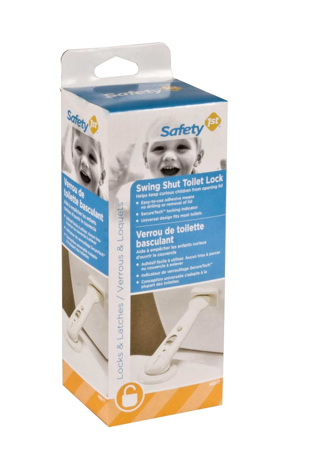 Product Description Safety 1st Swing Shut Toilet Lock This suction-mounted lock is easy to install and locks into position when the toilet lid is shut. You can open it easily, and the SecureTech indicator will help you know if it is locked or not. It provides an easy way to prevent children from throwing things into the toilet. Why You'll Love It: Safety 1st Swing Shut Toilet Lock is easy to use and will help lock the toilet lid so that children cannot open it. Automatically relocks when lid is lowered One-hand operation From the Manufacturer Help keep curious children from opening the lid with the Swing Shut Toilet Lock from Safety 1st. Sanitary, one-hand operation.