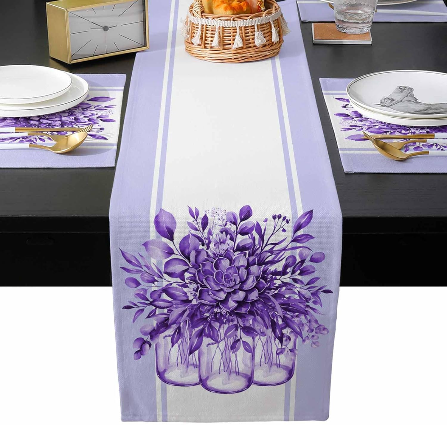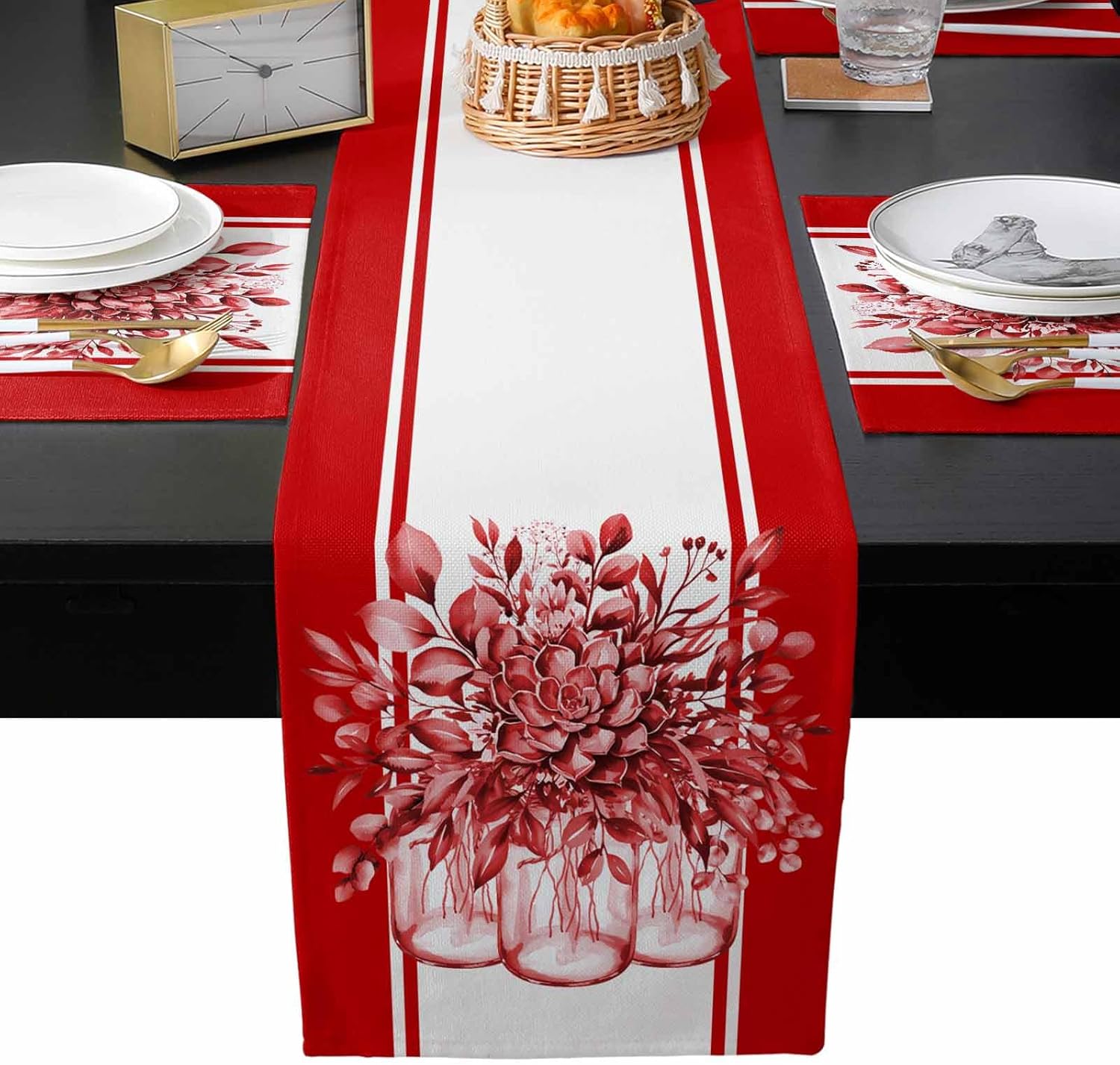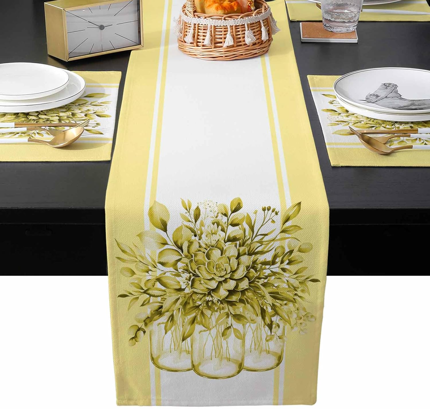 Please put our table runners on your table and decorate every special moment with your dear family! ✅Soft yet strong and durable✅Non-slip, protect porcelain bowl tableware✅Protect the table from stains✅Best decoration and protection on the table✅Foldable, easy to carry and storeHigh QualityThis table runner mats is usually made of cotton and linen, which is very healthy. Not only can you show the host’s taste in life, you can also win praise from the guests. Energetic AppearanceThe pattern of the table runner and table mats is clear and printed, with good color fastness, richness and not monotony, and the pattern has a strong three-dimensional effect. The feeling of higher taste! Great decoration for dining venues. Height MatchThe table runner is very suitable to match with wooden table, glass table, white dining table, wooden farmhouse table, or decorative dressing table, coffee table, TV table etc. Practical DecorationFashionable placemats will be the perfect decoration and quality of life for your home, canteen, kitchen, hotel and business office. It can also be used on a picnic. Use for outdoor activities, family gatherings, and holiday decorations. Easy to MaintainUse a damp cloth to wipe the stains left on the table mat, or use a gentle cycle to clean it in the washing machine at low temperature without bleaching.Package Included1 x Table Runner4 x Table Placemats