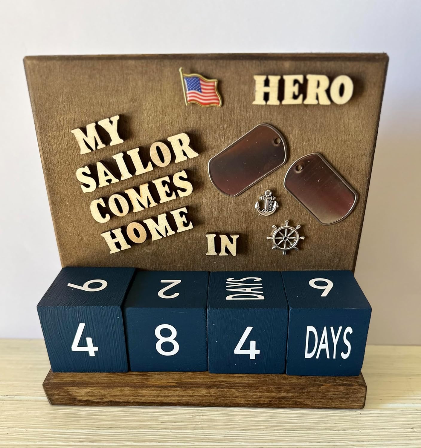 We love our military family members and it is very hard when they are deployed. We countdown the days until their safe return. This design is a wonderful visual for the whole family to enjoy as you countdown to their homecoming. The wood sign is about 7.75 inches and the shelf is about 2.5 inches. The wood is stained using mini wax honey. The 2 inch wood blocks are painted navy blue using acrylic paint. The lettering is also wood and is a natural color it says "My Sailor Comes Home In". I can personalize the lettering to add a name. Please send me a message. The embellishments are 2 plain dog tags, US Flag, an anchor and a wheel. Do you know someone who has a family member deployed? Purchase this countdown calendar for them to enjoy!