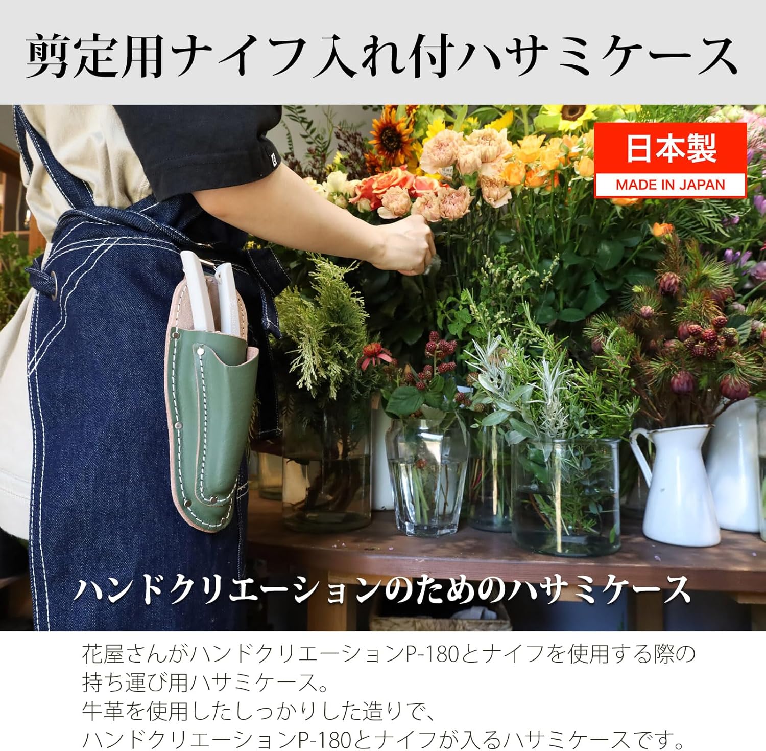 Introducing a case for the handcreation P-180 pruning scissors. Comes with pockets for storing flower knives, cutters, pens and more. Comes with a "hanger" for hanging on a belt. Made of cowhide leather. All colors are fashionable
