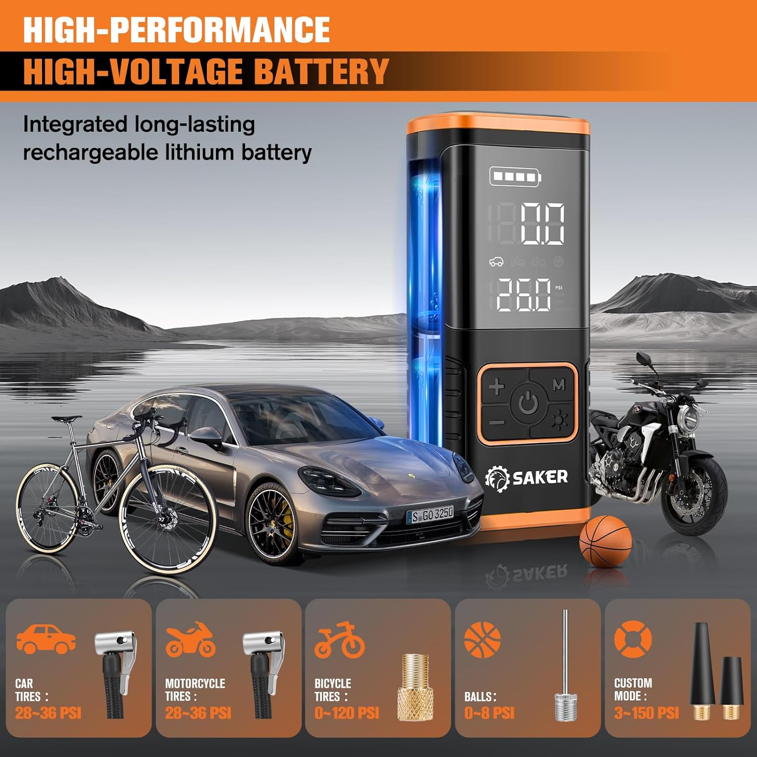 Saker 42 in 1 Magnetic Ratchet Screwdriver Set Orange + 150PSI Tire Inflator Air Compressor, Holiday & Christmas Gift Tool Bundle for Car, Home & DIY