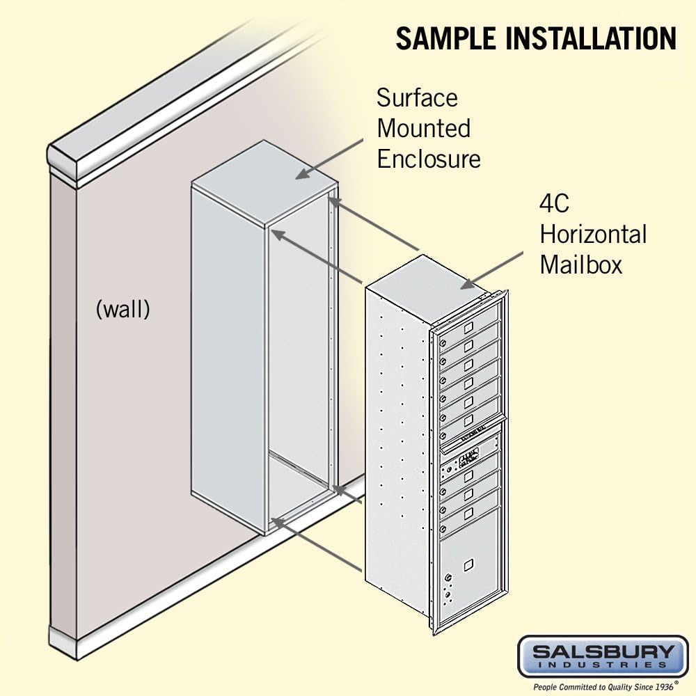 Constructed of heavy duty aluminum and stainless steel hardware, Salsbury 3800 series high security surface mounted 4C mailboxes can be accessed from the front through one (1) easy opening master door panel. These units provide a convenient means of installing 4C horizontal mailboxes in locations where walls cannot accommodate a recessed mounted installation. These 4C surface mounted horizontal mailboxes are durable and corrosion resistant that can be used indoors or outdoors and feature a powder coated finish in aluminum, bronze, gold and sandstone. All mailbox doors include a heavy-duty cam lock with a dust/rain shield and includes three (3) keys. A compartment equivalent to two (2) 3.25 in. high standard mailbox doors is used for outgoing mail collection and is labeled "Outgoing Mail". The outgoing mail compartment includes a weather protection flap, mail slot and carrier access door, which includes master commercial locks with two (2) keys for private access, and anti-fish plate on rear of mail slot to prevent tampering of outgoing mail. The 4C surface mounted unit include a U.S.P.S. approved 4C horizontal mailbox unit, matching enclosure and master commercial lock for private access. These surface mounted 4C horizontal mailboxes are ideal when private centralized mail delivery is desired. Ideal for apartments, condominiums, commercial buildings, residential developments, colleges, schools, private postal centers, corporate mail centers, military bases, government agencies and many other applications. For U.S.P.S. delivery of mail, contact your local postmaster for approval. Salsbury Industries is an ISO 9001: 2008 certified company and has excelled in the field of manufacturing since 1936.