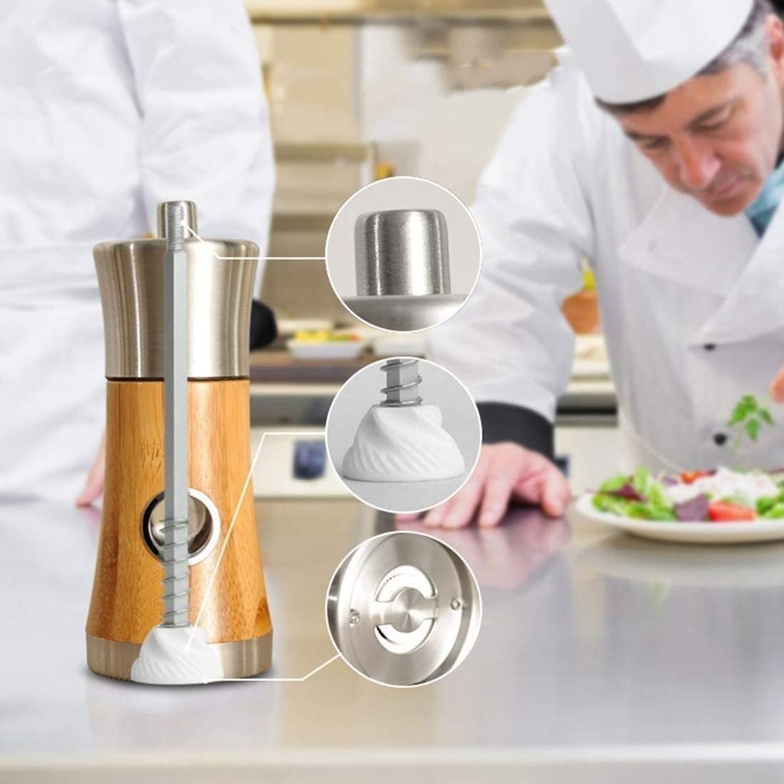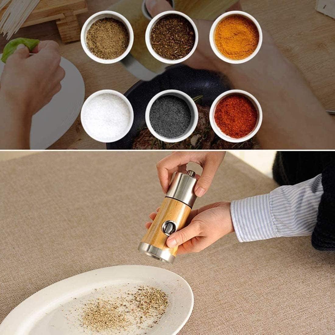 Material: Metal Product Description The Bamboo Wood Salt and Pepper Grinder provides the best cooking experience for everyone who loves to cook and host dinners. Salt and pepper grinders are essential for any kitchen. Crushing and grinding pepper and salt can sometimes be a bit messy and troublesome, but these salt and pepper shakers will make the job much easier. Made of high-quality wood, this salt and pepper grinder is stylish, elegant, and modern. It's perfect for the kitchen, dining table, restaurant, or travel. Grinding spices with this grinder will give your food a rich and delicious aroma. With this gourmet butler, you'll love your kitchen forever. Don't hesitate to make it your cooking assistant! Instructions: Step 1: Open the top and remove the top lid. Step 2: Place sea salt, Himalayan salt, kosher salt, peppercorns, red chili pepper, and black peppercorns into the grinder body. Step 3: Replace the lid and twist it back, rotating the top cap. Turn the bottom nut clockwise for a fine grind and counterclockwise for a coarse grind. The power will be output from the bottom of the grinder. Packaging: 1×Salt Grinder 1×Pepper Grinder