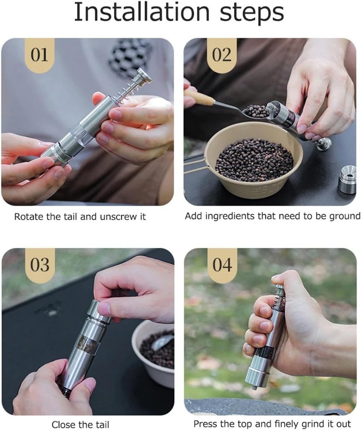 Pepper MillsType: Pepper GrinderMaterial: stainless steelSize: 136mm/5.35in * 25mm/0.98inNet weight: 166gModel Number : Thumb Pepper GrinderMaterial : Metal