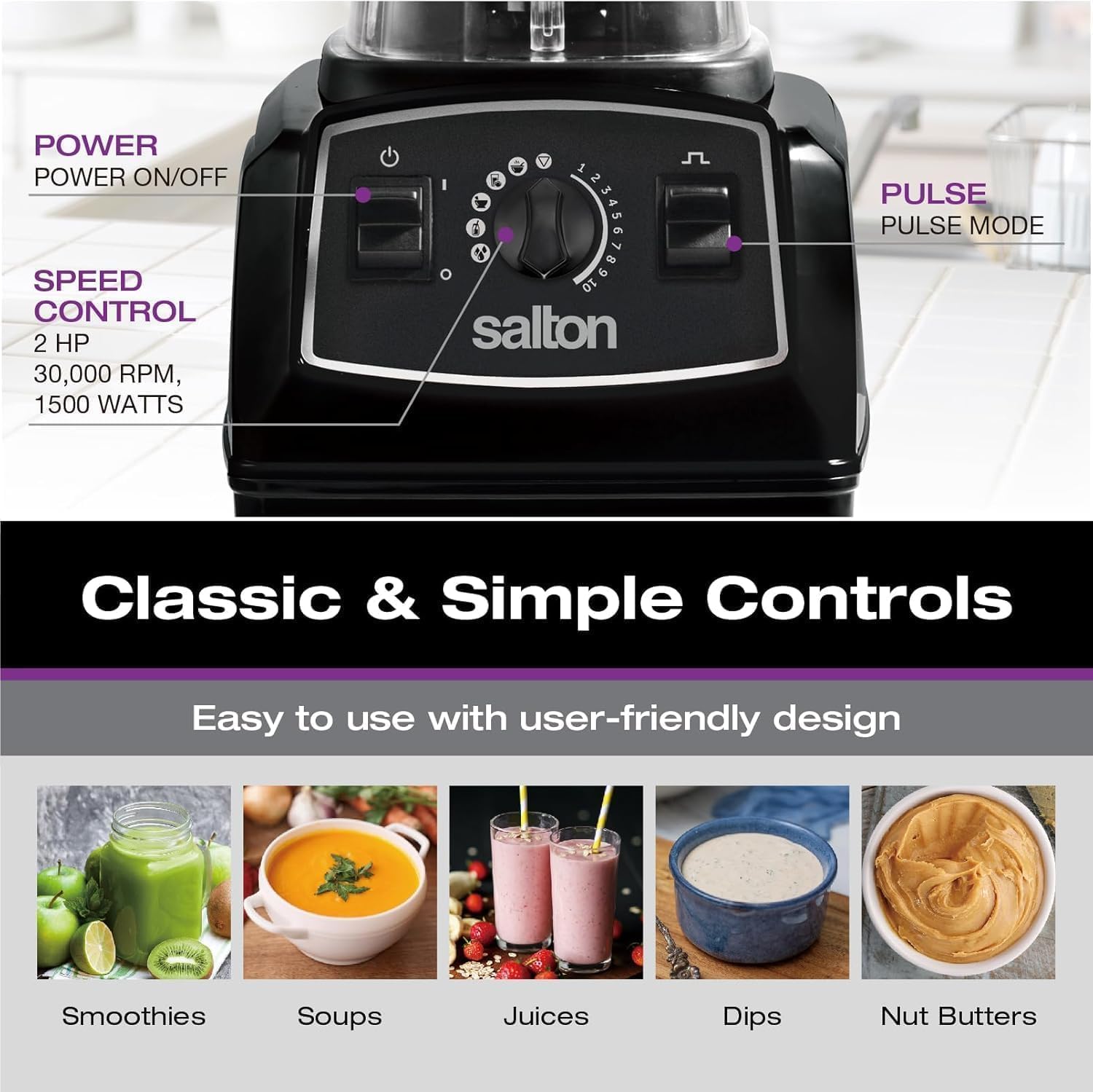 • Wide Blending Capabilities: Whole fruits/vegetables, frozen fruit, nuts, ice, smoothies, soups, sauces, dressings, dips