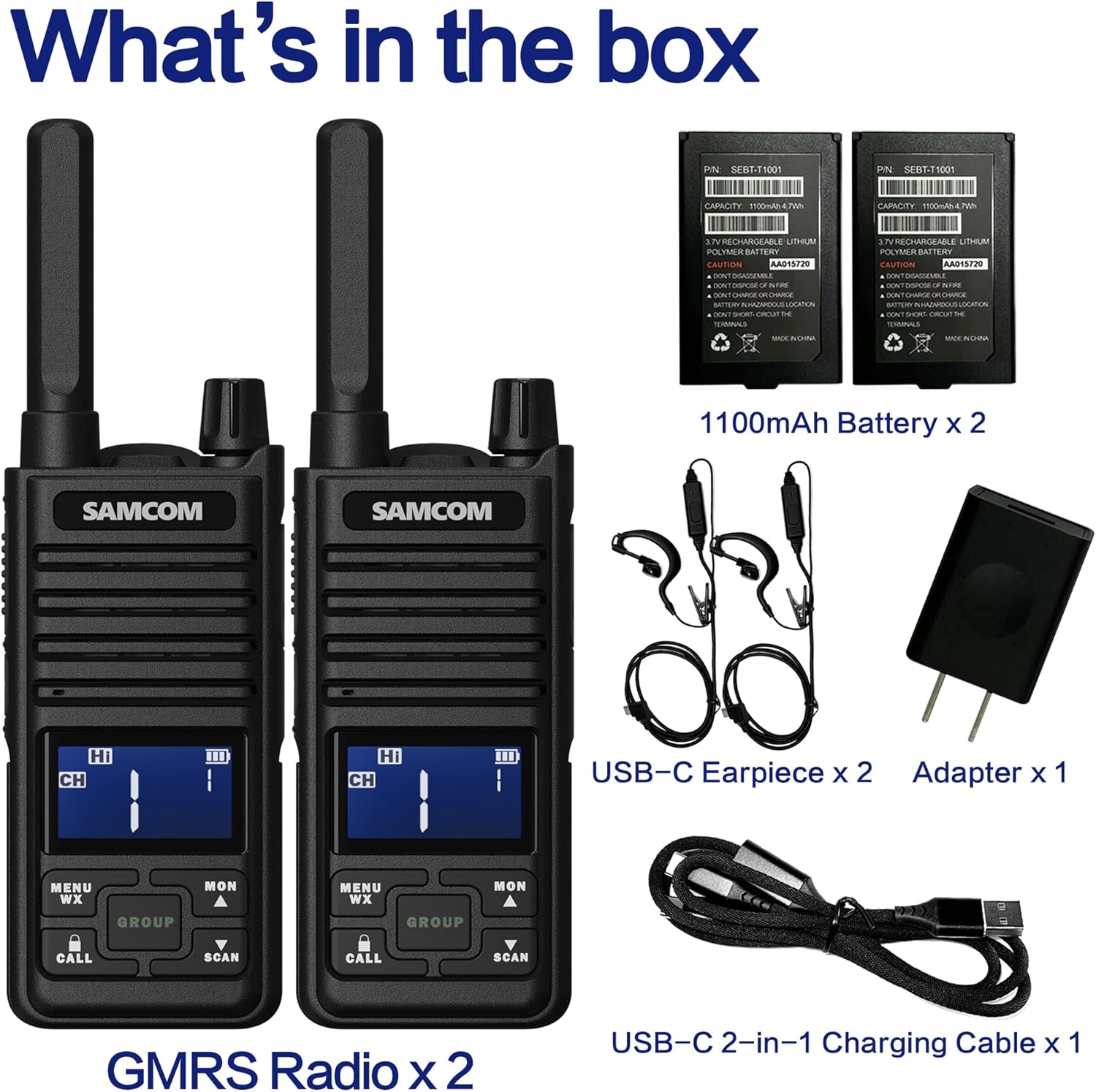 | BuiltIn Media | 2* SAMCOM T2 GMRS Long Range Walkie Talkie, 2* Earpiece, 2* Li-Polymer Batteries, 1* Dual Port TYPE-C USB Charger Cable, 1* AC Adapter, 1* User Guide |