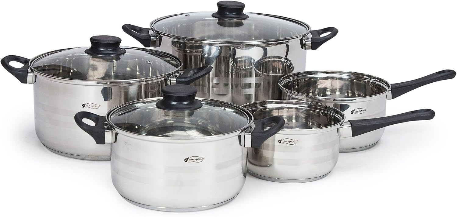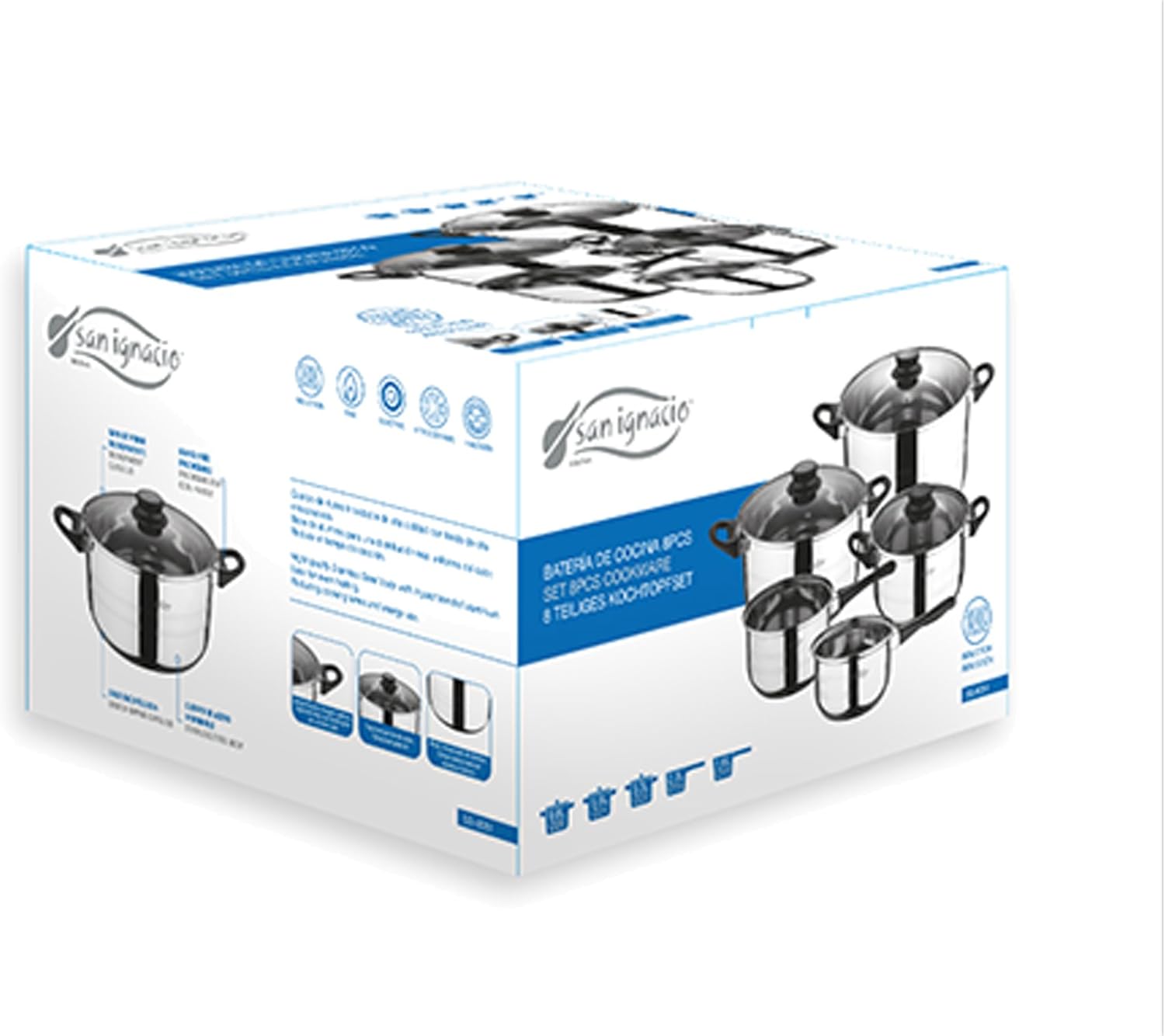 Product Description San Ignacio 8 pieces cookware set with swift and even heat conductivity and shiny insides. Suitable for home as well as professional kitchens. Set Contains: 1 x 8 pieces cookware set