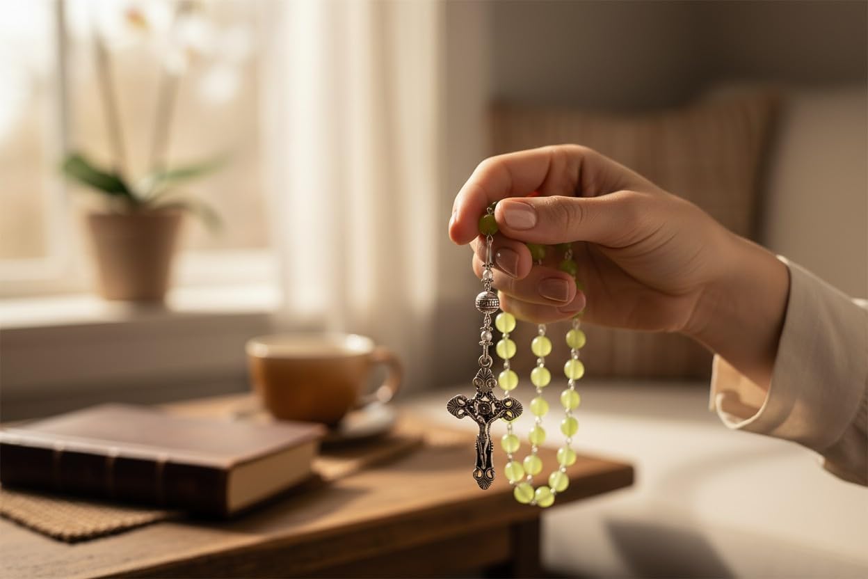 Seafoam Green Rondelle Beads Rosary with Silver Plated Crucifix and Pater Noster Bezel Medal Color Centerpiece Includes a Prayer Card Imported