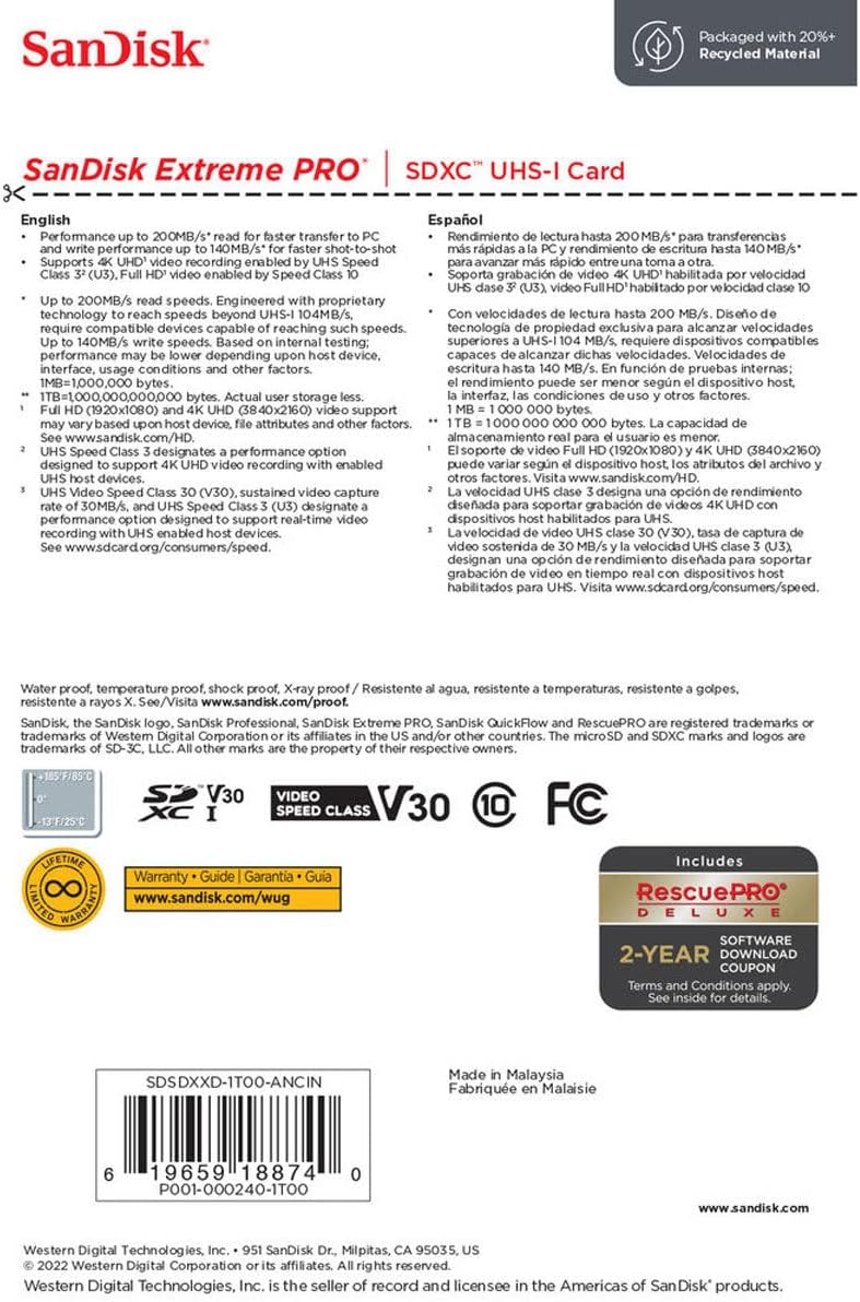 Gear that doesn't limit your creativityOur most powerful SD UHS-I memory card yet delivers performance that elevates your creativity. With shot speeds of up to 140MB/s and UHS speed Class 3 (U3) recording, you're ready to capture stunning high-resolution, stutter-free 4K UHD video. And, because your pace doesn't let up after the shots are in, it delivers up to 200MB/s transfer speeds for a faster postproduction workflow. Plus, it's built to withstand weather, water, shocks and other less-than-ideal conditions so you can rest assured that it's good to go wherever your work takes you.Improve your workflow efficiencyWith SanDisk® QuickFlow™ Technology, this card optimizes performance for timesaving media offloads with quick transfer speeds up to 200MB/s (64GB - 1TB). Pair with the SanDisk Professional PRO-READER SD and microSD to achieve maximum speeds (sold separately).Shot speeds up to 140MB/sWith shot speeds up to 140MB/s the card is perfect for capturing the action as it happens, without missing a beat.Perfect for 4K UHD videoSometimes speed is what you need. The SanDisk Extreme PRO SD UHS-I card delivers the performance to capture stunning, uninterrupted 4K UHD video.Stunning sequential burst mode shotsRated UHS Speed Class 3 (U3) and Video Speed Class 30 (V30), the SanDisk Extreme PRO SD UHS-I card lets you capture sequential burst mode shots without missing a beat.Durability you can count onBuilt for and tested in harsh conditions, the SanDisk Extreme PRO SD UHS-I card is temperature-proof, waterproof, shock-proof, and x-ray-proof.Recover images you accidentally deletedIncludes an offer for RescuePRO® Deluxe 2 year data recovery software, which lets you restore images you accidentally deleted.