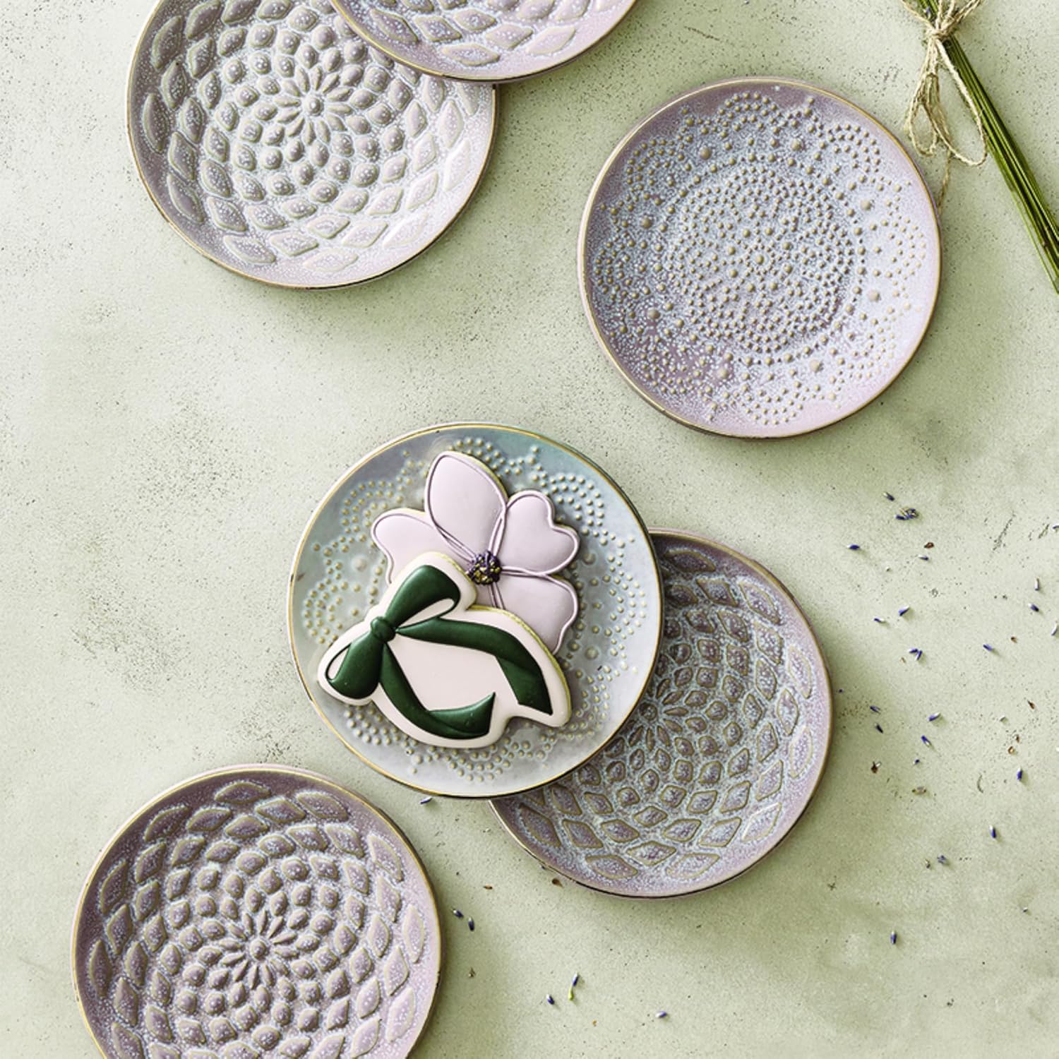 These lilac stamped ceramic appetizer plates bring texture and artisan charm to everyday entertaining. With debossed detailing and a soft glaze, they are perfect for serving small bites, desserts, or snacks at gatherings, showers, or casual celebrations.