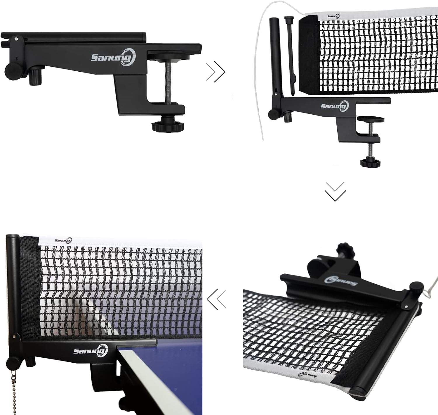 Why Choose Sanung Table Tennis Net and Post Set? Sanung treats every product with care, through meticulous manufacturing and strict inspection, so that each of our customers can get a intact product. What Are the Outstanding Features of the Ping Pong Net and Post? 1.Portable and foldable: you will take it on the go. 2.Thick material: allowing you use it for a long time, save your cost. 3.Adjustable tension and height: you can adjust the table tennis net based on your various requirements. 4.Easy to setup: quickly install it and enjoy the fun of sports. 5.Unverisal fit: great for daily training or professional competition. Easily to Setup: Step 1. Erect and fix the folded post, and take out the inner post; Step 2. Put the inner post of the net into the side of the net, and then put it into the post together; Step 3. The device in the rear half of the net can adjust the tension, and by adjusting the angle of this device, align the drawstring with the hole and penetrate it into it; Step 4. Tie the chain to the end of the rope, then straighten the rope, and then install the net post on the table. Press the left side and rotate the right side to adjust the tension of the net; Step 5. The knob under the net post can adjust the height of the net post, and the best standard height can be adjusted when used with the measuring net ruler. Specifications: Brand: Sanung Model: S406 Style: knob Color: black (post and net) Weight: 750G Applications: great for any intertional size tables (60 inch width) Max. Clamp Thinckness: 1.93inch Package Contents: 2 x Post 1 x Net 1 x Measure Ruler