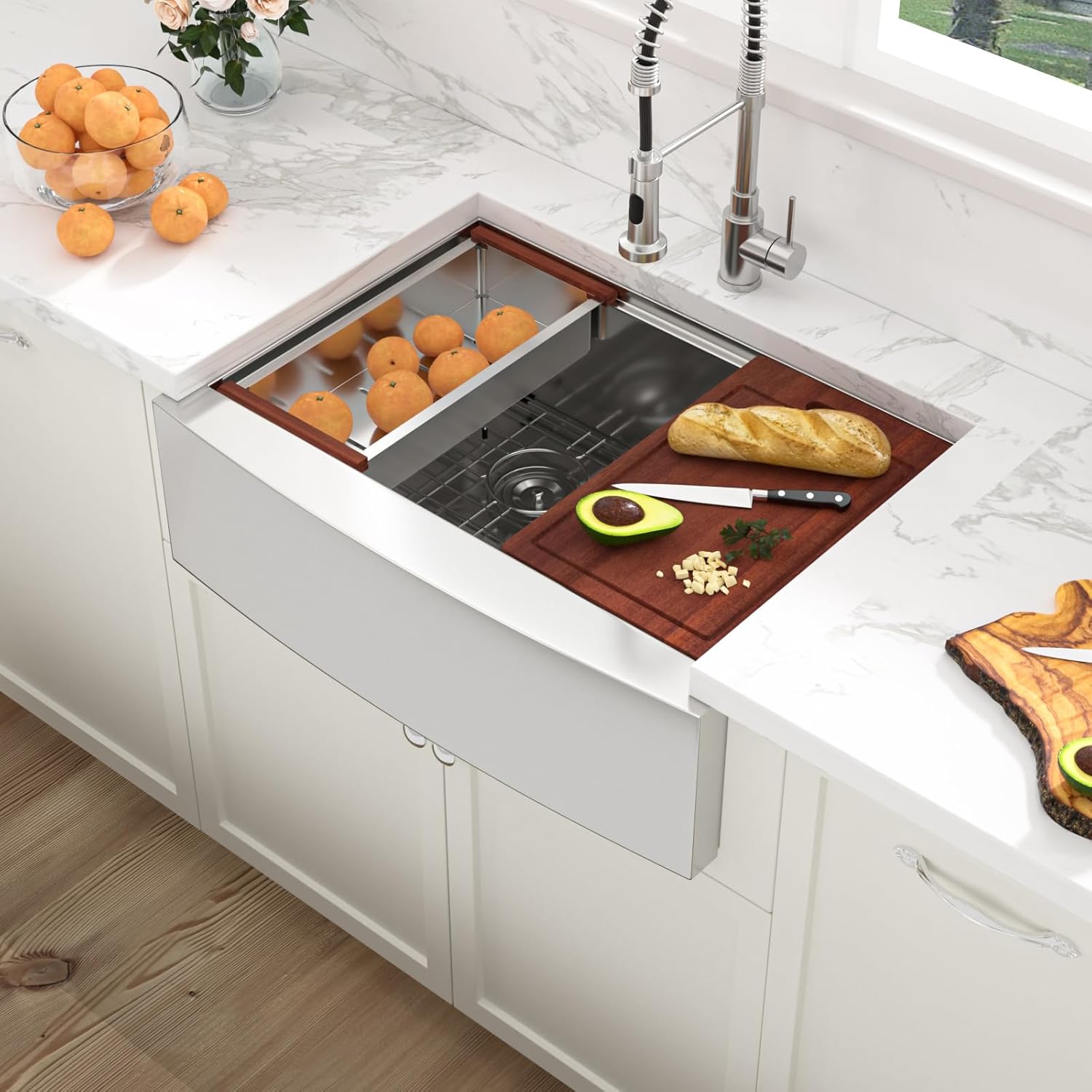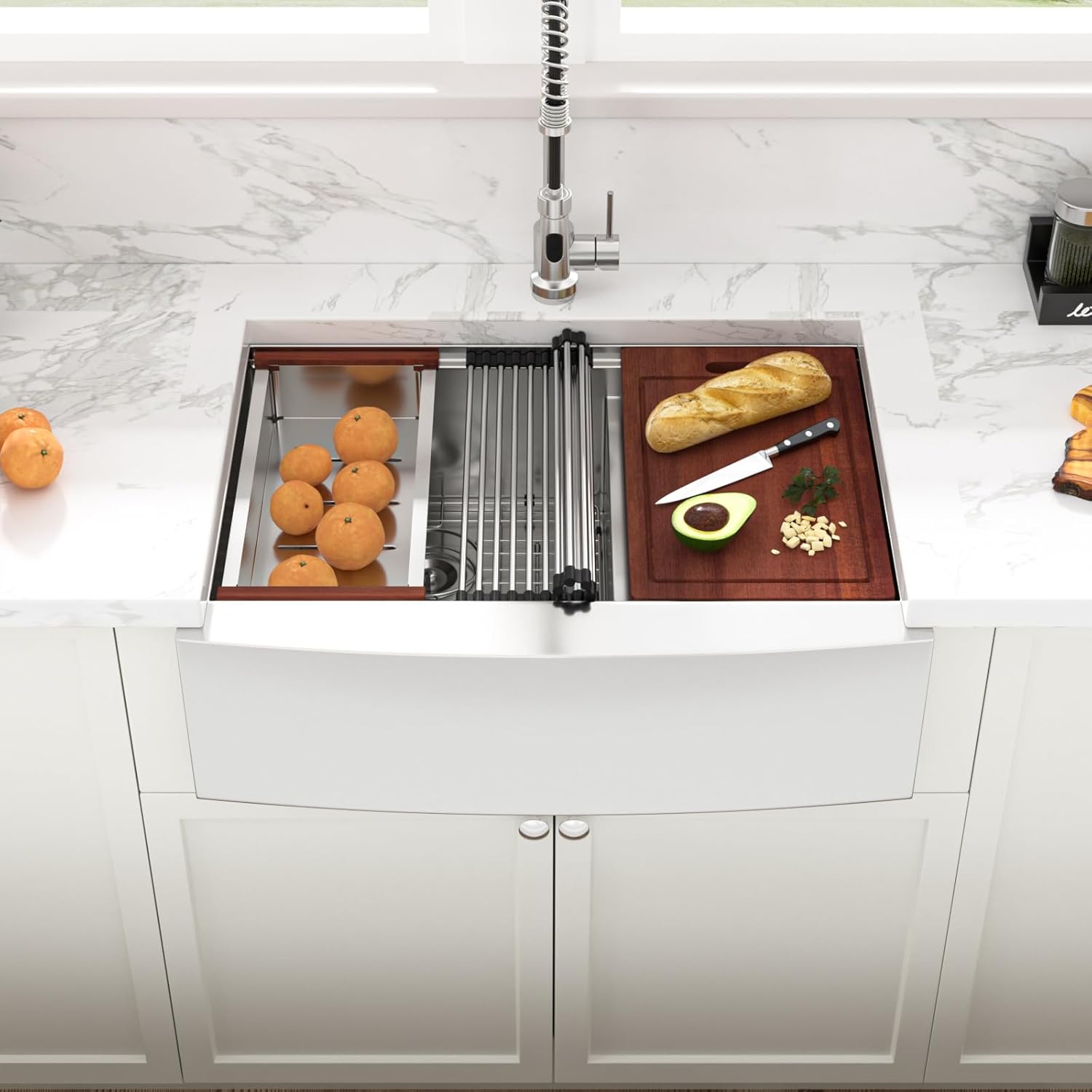 | Included Components | 2*bottom grid, 2*drain strainer, 30 Farmhouse kitchen sink, redwood cutting board+stainless steel colander, stainless roll drying rack |