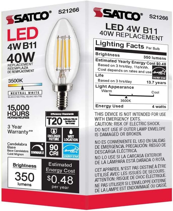 Satco's S21266 4-watt LED lamp is traditional, yet contemporary with its vintage style and energy saving LED technology. Elegantly illuminate any room in the house with this dimmable, clear bulb. Sophisticated and modern, this lamp delivers 15,000 hours of neutral white light.