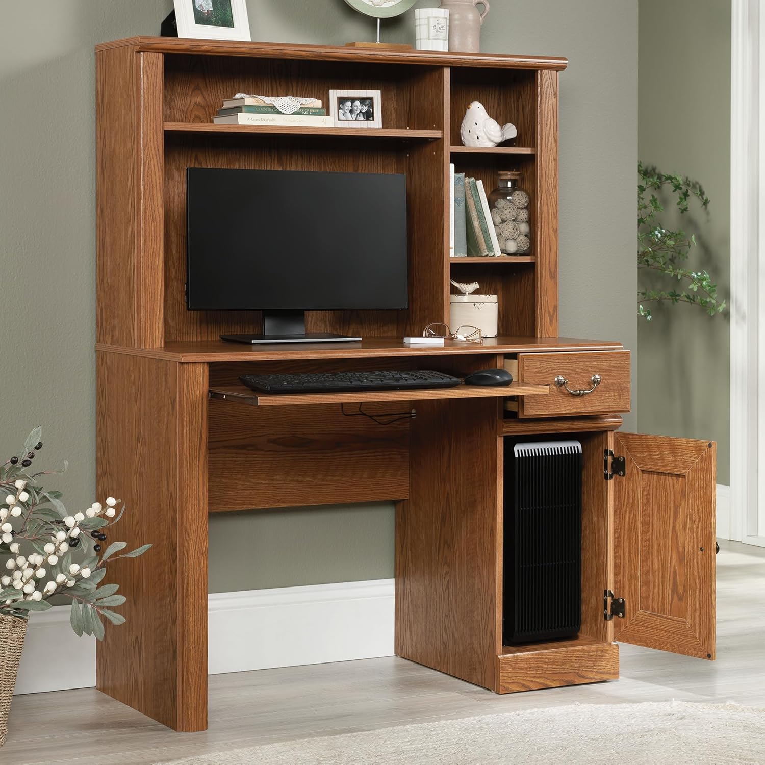 Enhance your at home workspace with this computer desk from the Orchard Hills collection. This handy desk provides you with the perfect amount of tabletop space for your desktop computer, important papers, and other must have office essentials. Key features include a slide-out keyboard/mouse shelf, an easy gliding storage drawer, and a storage area behind the raised panel door for a vertical CPU tower. Additional storage options can be found in the handy attached hutch. It features three adjustable shelves, making it the ideal space to store mail and other easy-to-access documents. Finished in Carolina Oak, this stylish desk adds classic beauty and function to your home.