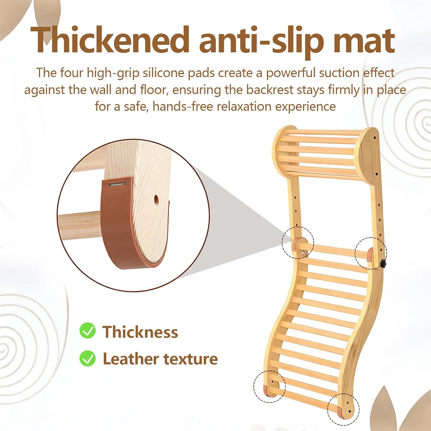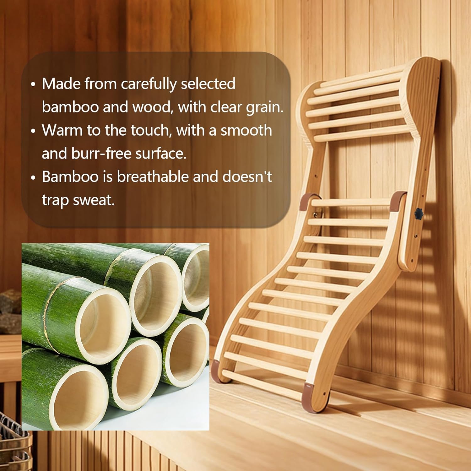 Professional Ergonomic Support for Your Ultimate Sauna Experience Upgrade your relaxation routine with our Adjustable Sauna Backrest. Designed for those who seek both comfort and durability, this backrest features a unique S-shape design that mimics the natural curvature of the human back. Unlike traditional flat benches, our flexible bamboo slats minimize pressure points and remain cool to the touch. Product Specifications:Adjustable Height: 26 inches to 33.5 inches.Headrest Settings: 5-level vertical adjustment.Material: Heat-resistant, polished bamboo.Stability: 4 reinforced anti-slip pads.Why Choose Our Sauna Backrest?Customizable Fit: The detachable pillow and telescopic frame allow you to find the most comfortable position for your neck and lumbar in seconds[cite: 3, 9]. Durable & Easy Care: The water-resistant surface is easy to maintain; simply wipe it down with a damp cloth after use to keep it looking new[cite: 6, 13]. Safety First: We've replaced common sliding issues with high-friction pads, ensuring your backrest stays put on any sauna bench or floor. Frequently Asked Questions:Q: Can this be used in an infrared sauna? A: Yes, it is specifically designed for infrared, barrel, and traditional steam saunas. Q: Is the material treated with chemicals? A: Our backrest features a clean, odorless surface without harmful coatings, making it safe for high-heat environments.