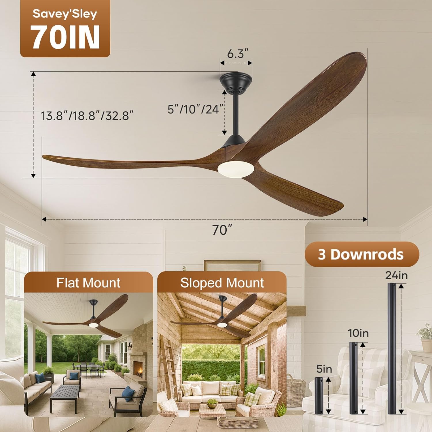 Savey'Sley 70 Inch Outdoor Ceiling Fan with Light and Remote, 3 Propeller Walnut Wood Blades & 40 Inch Black Ceiling Fan Downrod