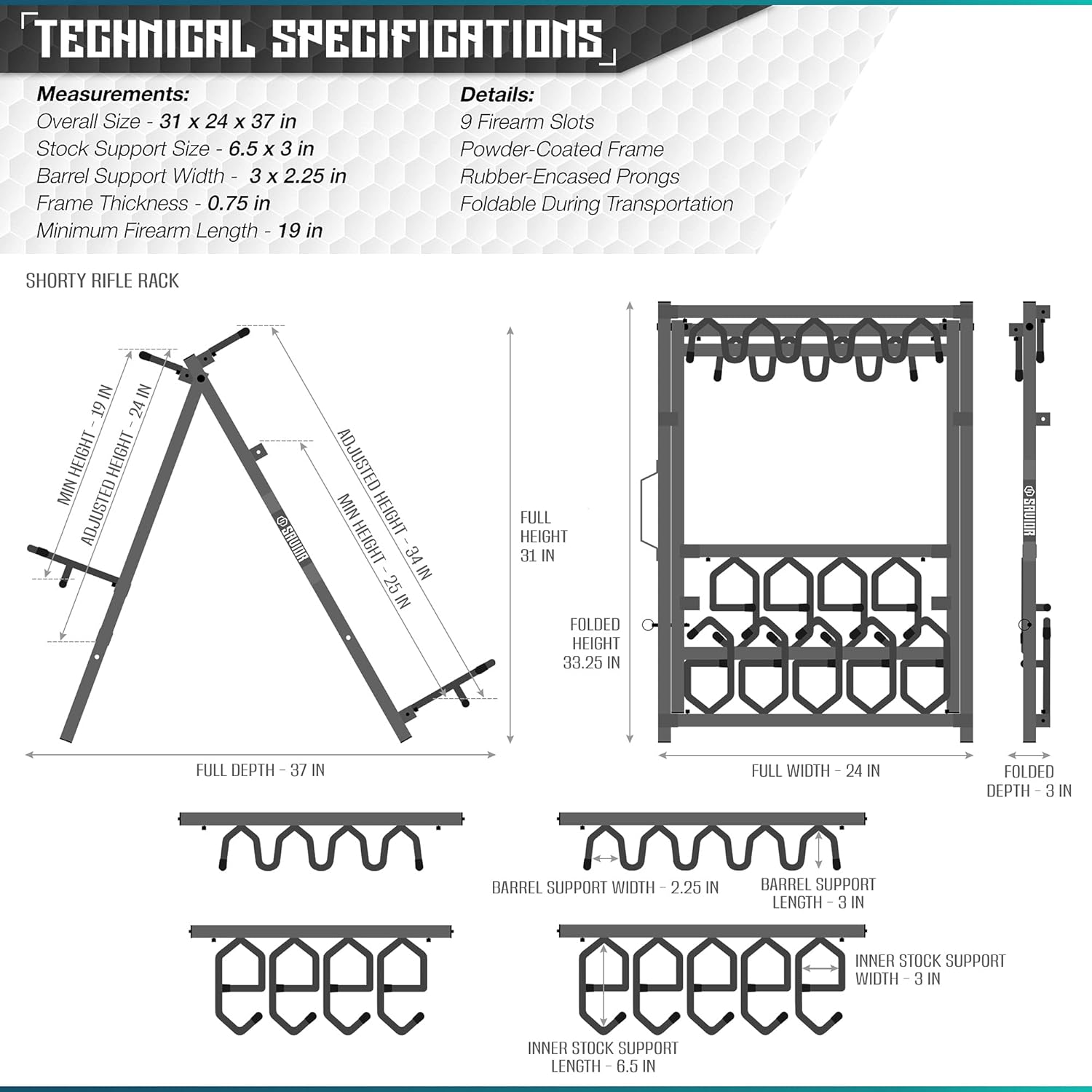 Savior Equipment Shorty Rifle Rack For Outdoor Shooting Range Deer Camp & Indoor Storage Display StandWhat is Included1 x Steel Rifle & Shotgun RackProduct FeaturesShorty Rifle RackMade for those who welcome all shapes and sizes, our rack not only fits up to 9 firearms, but also has a specialized frame, allowing you to fit shorter firearms.All-InclusiveDesigned to fit an even wider range of firearms with its height-adjustable supportst, this rack can hold any firearm with a minimum 19 inch OAL.Rigid StructureSpring-loaded latches make it a cinch to adjust and lock the supports. Simply slide and hold the latch to lease the pin from the frame.Frame DurabilityRubber-encased prongs prevent scratches to your firearms, while the powder-coated frame provides increased wear-resistance.Innovative DesignCollapses flat so you'll have more room for what really matters on range day. Setup is simple and does not require additional tools.Technical SpecificationsOverall Size | 31" x 24" x 37"Stock Support Size | 6.5" x 3"Barrel Support Width | 2.25" x 3"Minimum Firearm Length | 19"Frame Thickness | 0.75"Case Material100% Powder-Coated Steel5 Rifle Slots4 height Adjustable SBR SlotsRubber Encased ProngsFoldable During Transportation
