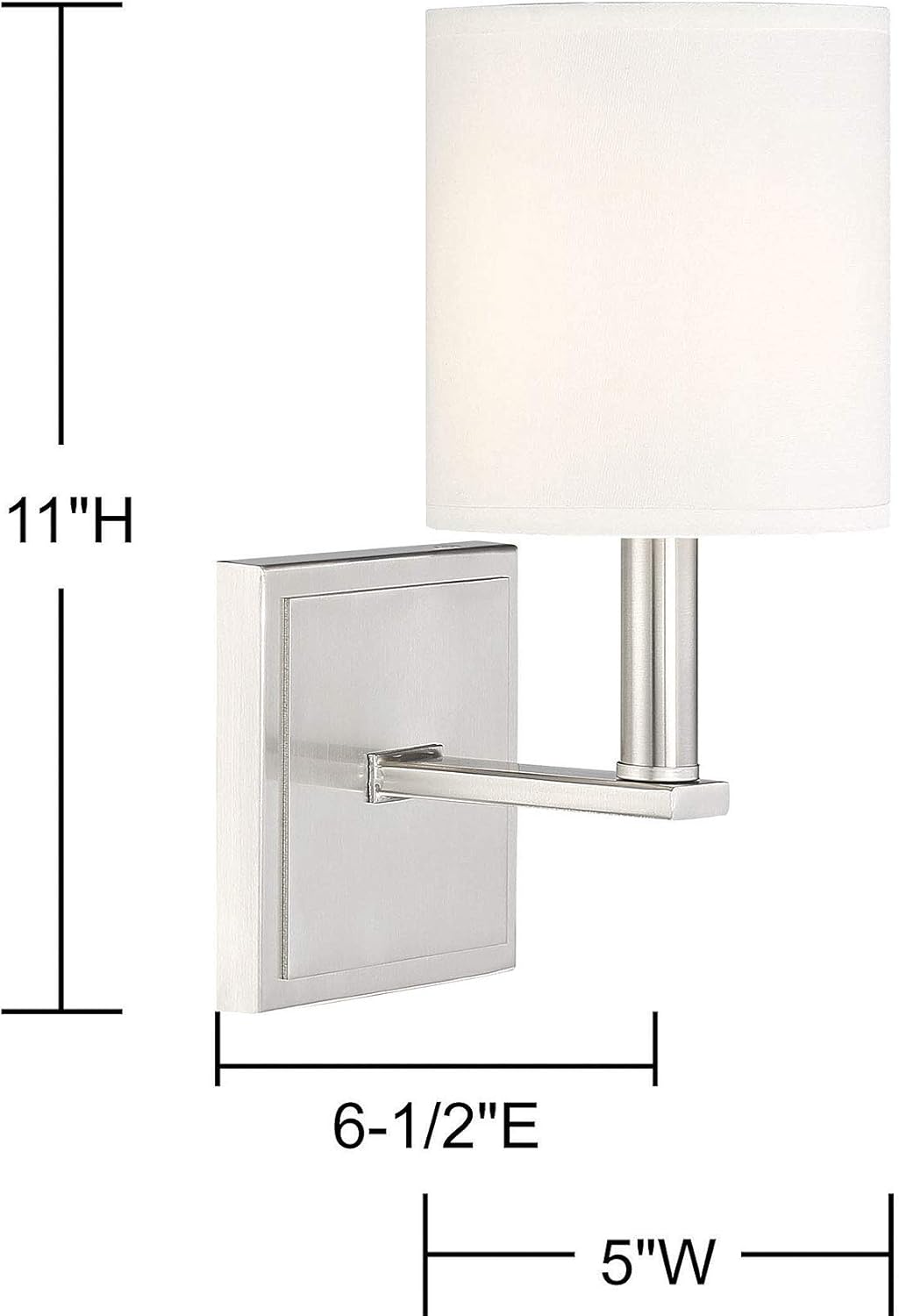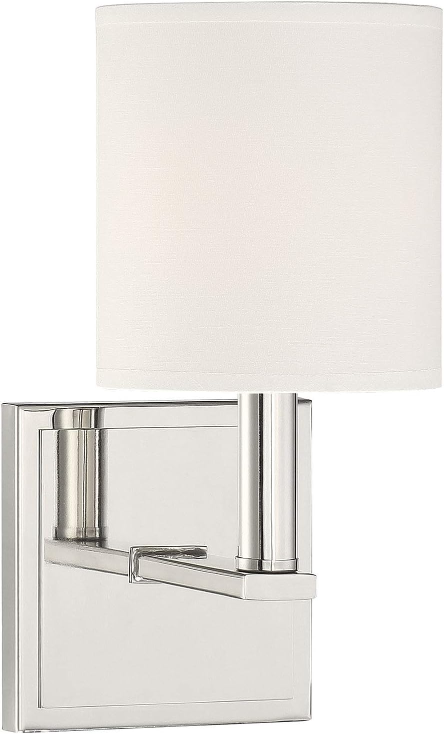 Chic and contemporary! The Waverly wall sconce is a sleek fixture to add a beautiful, polished layer of light to your home’s overall interior lighting design. Plus, the clean lines and soft glow create a subtle and serene mood. The frame has an outlined square wall plate and a bold L-shaped light arm with a satin nickel finish. A streamlined, cylindrical white shade encloses one 60W candelabra size bulb for lovely, glare-free illumination. The Waverly’s elegance blends well with many decor styles, such as modern, farmhouse and transitional. Measuring 5" wide and 11" high and extending 6.5" from the wall, it's an ideal fit for a bathroom, bedroom, dining area, living room, kitchen, family room, foyer, media room, office or hallway.