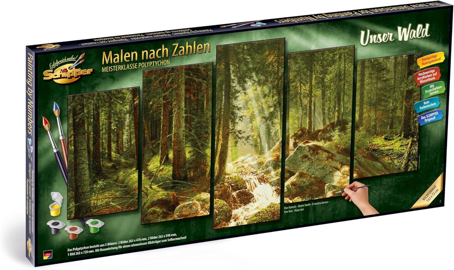 Soft sunlight breaking through the lush forest canopy brings a feeling of serenity to this immersive paint-by-number landscape created by five panels for gallery-style wall art. Enjoy creating an artistic masterpiece in your own home. You will appreciate the high-quality pre-mixed artist’s paints in our premium paint-by-number kits. Created by a well-known German artist, each kit includes pre-printed textured art board, pre-mixed acrylic paints, artist paintbrush, and easy instructions. 50 x 28" (127 x 71cm).