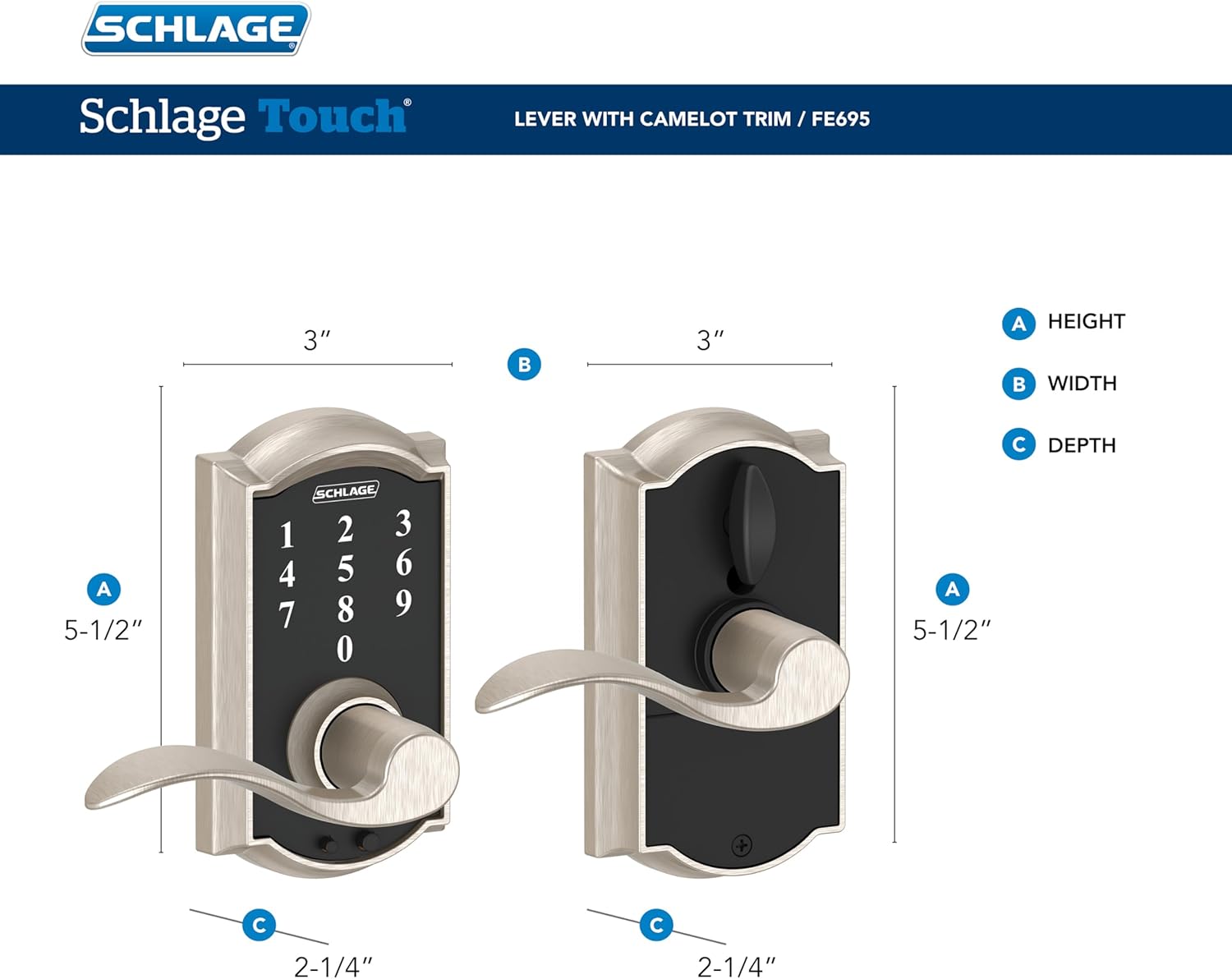 | Included Components | Schlage FE695 CAM 716 ACC Touch Camelot Lock with Accent Lever, Electronic Keyless Entry Lock, Aged Bronze |