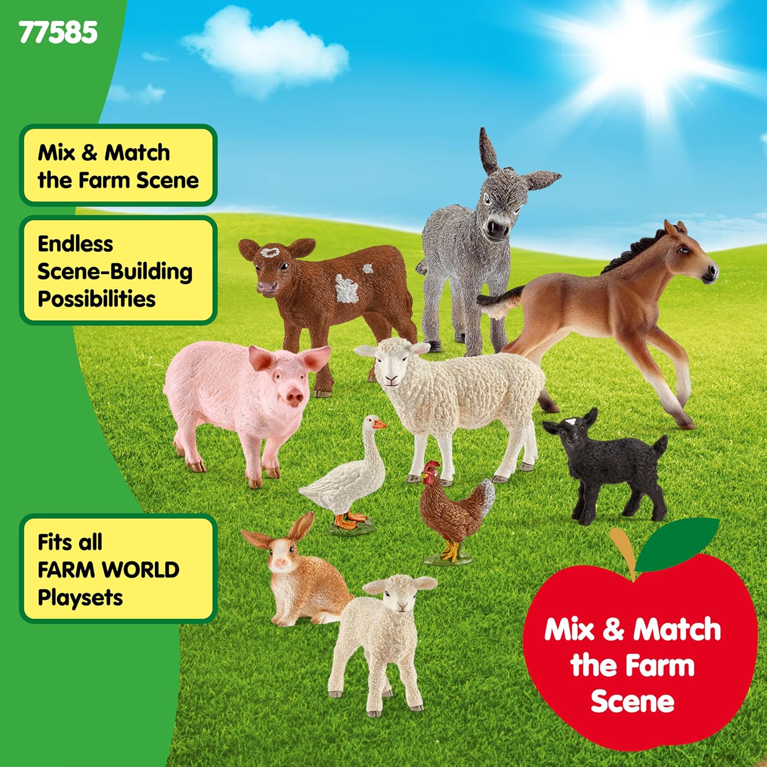 Oink! Neigh! Moo! And Cock-a-Doodle-Doo! The countryside is calling all little ranchers to explore sunny pastures with the 10-piece Farm Animal Figurine Bundle! This expansive starter set of realistic animal toys from schleich FARM WORLD features 10 barnyard favorites, including a wobbly-legged donkey foal, a spotted calf, and baby horse figure. Boys and girls will smile brightly as they turn the playroom into a barn through screen-free activity.Help the tiny lamb find its footing in the pasture while the goose explores the pond. Will the pink piggy get into a muddy mess? Where will the bunny hop next? How high will the baby goat climb the haystacks? These handheld toys feature lifelike details, like the hen's feathers and the sheep’s wool, helping toddlers learn different species while they dream up stories about life on the range.These educational toys foster empathy and curiosity about nature for open-ended, Montessori-style imaginative play. The collection is endlessly expandable and fits perfectly with other schleich FARM WORLD animal playsets and figurines. Built with high-quality materials, these durable animal figures make a wonderful birthday gift or Christmas present that will bring long-lasting fun to kids ages 3+.