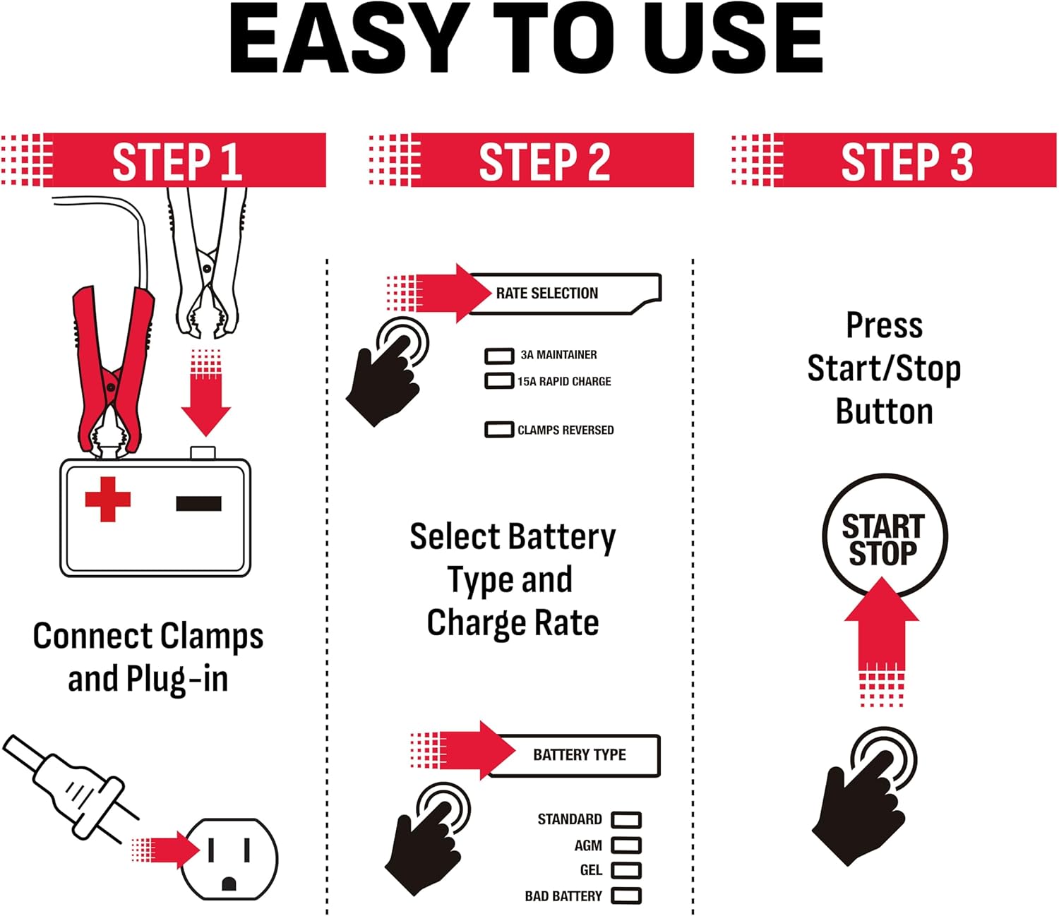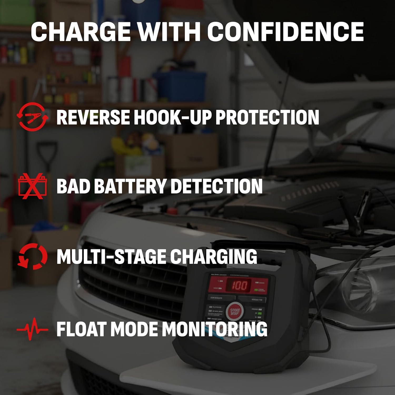 Stop worrying about whether your car will start on a freezing morning or a blazing hot afternoon. The Schumacher Electric SC1280 Fully Automatic 15A Battery Charger and Maintainer offers the ultimate peace of mind for prepared drivers. Designed for budget-conscious DIYers who value reliability, this 4-in-1 automotive power solution charges, maintains, tests, and restores 6V and 12V batteries, ensuring your vehicle is always ready to go. Proven Power for Your Home Garage Schumacher Electric has been an American leader in power innovation for generations. Schumacher doesn’t just build chargers: it builds confidence. The SC1280 delivers immediate 15A rapid charging power to get you back on the road quickly, even with large batteries. Unlike generic competitors, Schumacher’s microprocessor-controlled technology automatically adjusts the amperage rate to maximize charging, providing a custom charge rate for compatible batteries, including standard, AGM, gel, and deep-cycle batteries. The SC1280’s rapid 15-amp 12V charge to get you back on the road quickly, but it also features a 3A maintain mode to ensures your battery stays at optimal levels without overcharging. For 6V batteries, a 2A charge mode does the job. The charger’s commitment to excellence offers reliable performances for a wide range of consumers and keeps their batteries fully charged and healthy year round. Extend Battery Life and Save Money Battery replacements are expensive. The SC1280 is an investment that pays for itself by extending the life of your current batteries. The advanced desulfation mode detects performance-robbing sulfation and restores lost power to older batteries, effectively reviving them. Plus, the built-in battery tester provides quick diagnostics, so you know the exact health of your battery before emergency strikes. Safety-First Engineering Automotive maintenance, especially battery-related maintenance, is intimidating. That’s why the SC1280 incorporates reverse clamp protection. If the clamps are accidentally reversed, the unit will not operate, protecting your battery, your vehicle, and your person from damage. The smart trickle charge and maintain mode keeps the battery at optimal voltage so it can be left connected to the charger safely without fear of overcharging. Built for the Real World Whether charging a battery in a classic car, a marine battery for your boat, or your daily commuter SUV, this durable, AC-powered charger is up to the task. It features a simple digital interface, a 6-foot power cord, 6-foot booster cables, and solid construction designed to withstand the rigors of a working garage. Choose Schumacher Electric for its more than 75 years of American ingenuity and legacy of quality and innovation, guaranteed to keep you rolling. En Español Deja de preocuparte por si tu coche arrancará en una mañana helada o en una tarde abrasadora. El cargador y mantenedor de baterías totalmente automático Schumacher Electric SC1280 de 15 A ofrece la tranquilidad definitiva para conductores prevenidos. Diseñado para aficionados al bricolaje con presupuesto ajustado que valoran la fiabilidad, esta solución de energía automotriz 4 en 1 carga, mantiene, prueba y restaura baterías de 6 V y 12 V, asegurando que tu vehículo siempre esté listo para salir. Potencia comprobada para tu taller en casa Schumacher Electric ha sido un líder estadounidense en innovación energética por generaciones. Schumacher no solo fabrica cargadores: genera confianza. El SC1280 ofrece 15 A de carga rápida inmediata para que vuelvas a la carretera rápidamente, incluso con baterías grandes. A diferencia de competidores genéricos, la tecnología controlada por microprocesador de Schumacher ajusta automáticamente la corriente para maximizar la carga, proporcionando una tasa de carga personalizada para baterías compatibles, incluidas estándar, AGM, gel y de ciclo profundo. El SC1280 ofrece una carga rápida de 15 A a 12 V para devolverte pronto a la carretera, pero también cuenta con un modo de mantenimiento de 3 A que asegura que la batería se mantenga en niveles óptimos sin sobrecargarla. Para baterías de 6 V, un modo de carga de 2 A realiza el trabajo. El compromiso del cargador con la excelencia ofrece un rendimiento fiable para una amplia gama de usuarios y mantiene sus baterías completamente cargadas y sanas durante todo el año. Alarga la vida de la batería y ahorra dinero Reemplazar baterías es caro. El SC1280 es una inversión que se amortiza al prolongar la vida de tus baterías actuales. El avanzado modo de desulfatación detecta la sulfación que reduce el rendimiento y restaura la potencia perdida en baterías más antiguas, reviviéndolas eficazmente. Además, el probador de batería incorporado ofrece diagnósticos rápidos, para que conozcas el estado exacto de tu batería antes de que surja una emergencia. Ingeniería centrada en la seguridad El mantenimiento automotriz, especialmente el relacionado con la batería, intimida a muchos. Por eso el SC1280 incorpora protección contra inversión de polaridad en las pinzas. Si las pinzas se conectan al revés accidentalmente, la unidad no funcionará, protegiendo tu batería, tu vehículo y a ti de daños. La carga de goteo inteligente y el modo de mantenimiento mantienen la batería en un voltaje óptimo para que pueda permanecer conectada al cargador de forma segura sin riesgo de sobrecarga. Diseñado para el mundo real Ya sea cargando una batería de un coche clásico, una batería marina para tu barco, o la del SUV del día a día, este cargador resistente alimentado por CA está a la altura. Cuenta con una interfaz digital sencilla, un cable de alimentación de 6 pies, cables de arranque de 6 pies y una construcción sólida diseñada para soportar las exigencias de un taller activo. Elige Schumacher Electric por sus más de 75 años de ingenio estadounidense y su legado de calidad e innovación, garantía de que te mantendrás en