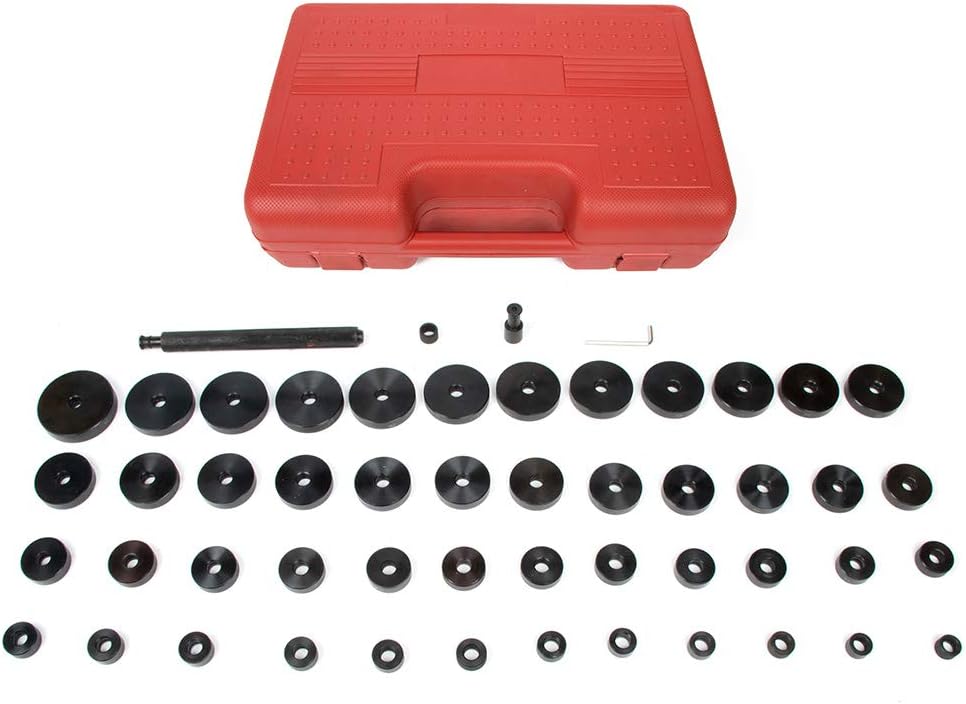 Easy to use Select the right size bushing driver to insert into the front of the shaft, hit with hammer to finish the job. Suitable for auto repair shop and home. Fit for Most Cars What You Get 49pcs bushing discs 1pc 12 mm (0.47 in) shaft 1pc 180 mm (7.08 in) handle 1pc hex wrench 4pcs O-rings 1pc blow-molded case Bushing Driver Set consists of the following sizes 18, 19, 20, 21, 22, 23, 24, 25, 26, 27, 28, 29, 30, 31, 32, 33, 34, 35, 36, 37, 38, 39, 40, 41, 42, 43, 44, 45, 46, 47, 48, 49, 50, 51, 52, 53, 54, 55, 56, 57, 58, 59, 60, 61, 62, 63, 64, 65 and 75mm Material High strength carbon steel with black anodizing process treatment