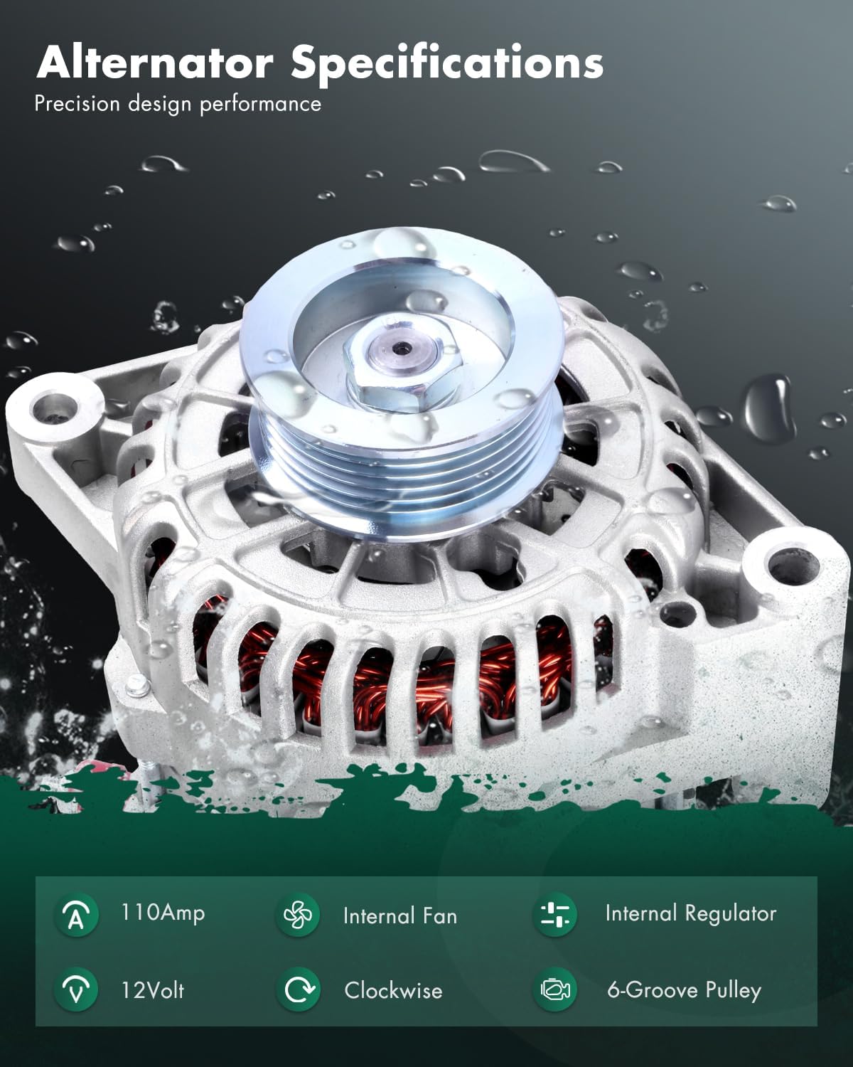 | Special Features | 2001 for Ford for Mustang 3.8L,2002 for Ford for Mustang 3.8L,2003 for Ford for Mustang 3.8L,2004 for Ford for Mustang 3.8L,2004 for Ford for Mustang 3.9L, Voltage: 12V; Amperage: 110Amp; Rotation: CW (Clockwise); Regulator: IR (Internal Regulator) ; Fan: IF (Internal Fan); Grooves: 6-Groove Pulley |