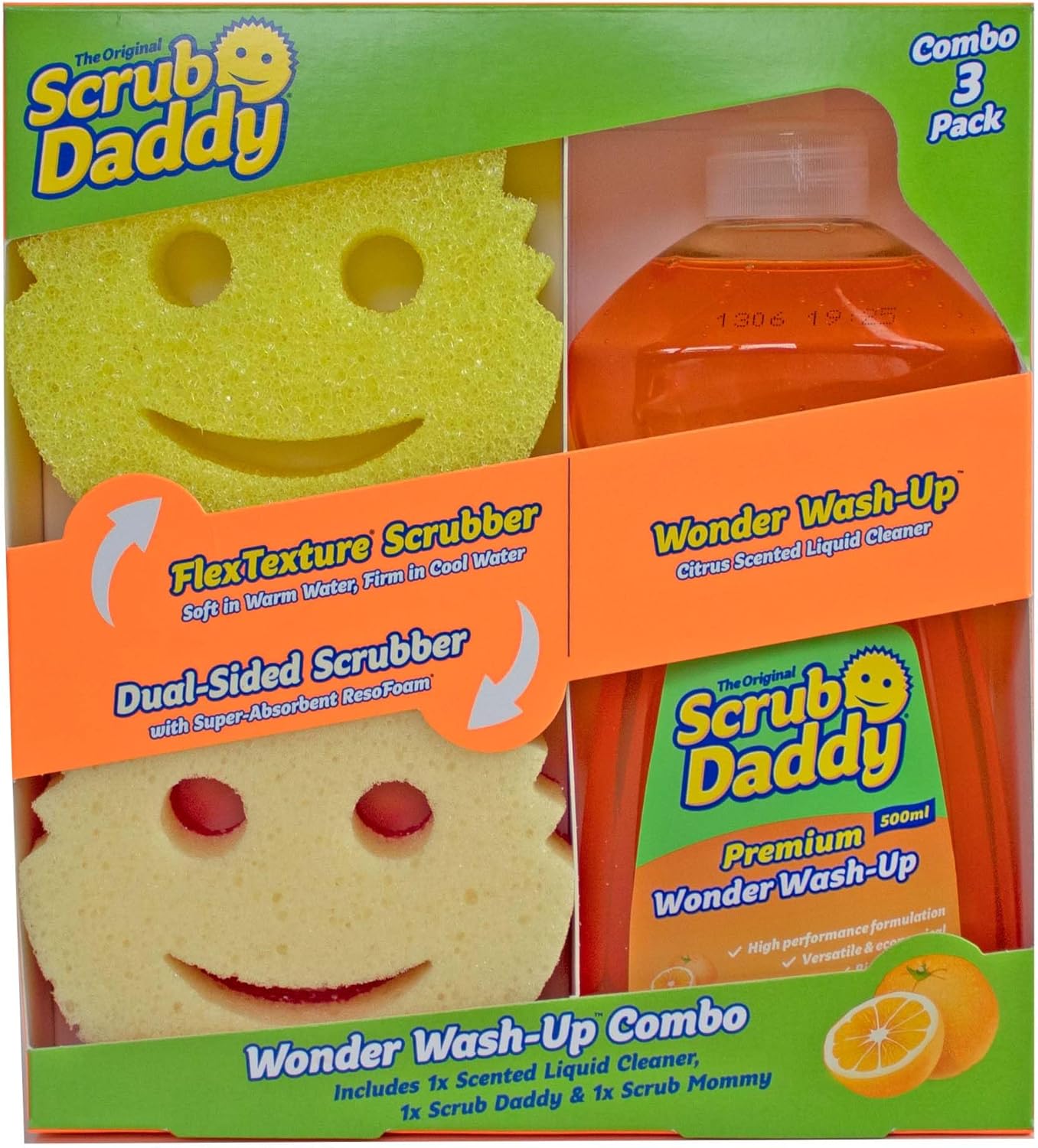 Upgrade your dishwashing routine with the Scrub Daddy Wonder Wash-Up Combo - a complete, high-performance cleaning set designed to make your kitchen sparkle. This convenient all-in-one pack includes a 500ml bottle of Wonder Wash-Up liquid, one original Scrub Daddy FlexTexture scrubber, and one dual-sided Scrub Mommy sponge, giving you everything you need to tackle daily dishwashing with ease and efficiency. The powerful Wonder Wash-Up liquid is tough on grease and grime yet safe for use on a variety of surfaces, making it the perfect cleaning partner for your Scrub Daddy and Scrub Mommy. Its rich formula ensures sparkling results every time, while the invigorating zesty orange scent fills your kitchen with a fresh, citrusy aroma that enhances your cleaning experience. The included Scrub Daddy sponge features FlexTexture technology that changes texture with water temperature - firm in cold water for stubborn messes and soft in warm water for lighter cleaning jobs. The Scrub Mommy adds extra versatility with her dual-sided design: one side features the same FlexTexture scrubber, while the ResoFoam sponge side generates rich suds and stays soft for gentle wiping. Not only does this washing up sponge combo deliver superior cleaning performance, but it also supports mindful living. The Wonder Wash-Up liquid is proudly vegan and biodegradable, and never tested on animals. It comes in a 100% recyclable plastic bottle, for a more responsible cleaning choice for households that care about both cleanliness and the planet. Whether you're scrubbing, wiping, or washing, this Scrub Daddy multipack combo brings joy, performance, and responsibility to your kitchen sink.