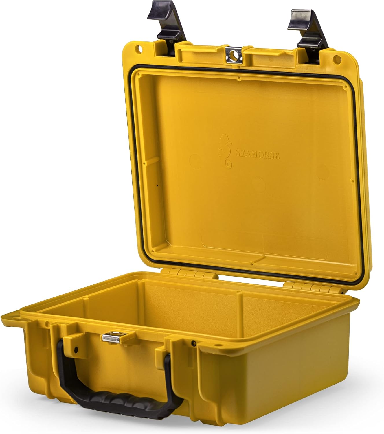 Seahorse Protective Cases keeps your valuable equipment safe. Close and latch your Seahorse cases to automatically safely seal your gear against water, air and dust. Its tough with Acuform foam or dividers will keep your camera, video or high cost equipment safe from impact, providing safe, secure protection from the elements. Built-in padlock holes give extra safety. Seahorse optional locking latches give added security and keeps out prying hands.