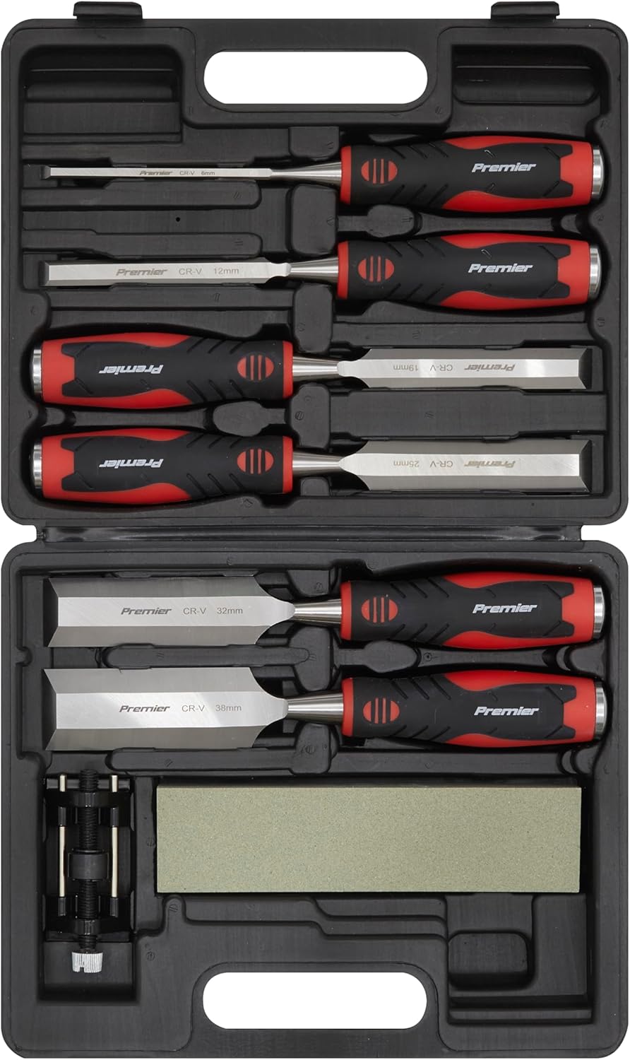 Chrome Vanadium steel. Bevel edged blades. Full length hammer-thru shafts with striking cap. Contoured handles with soft grips for added comfort and control. Supplied in storage case.