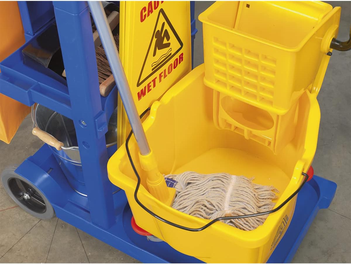 Product Description Robust unit fitted with two castors and two rubber wheels. Designed to accommodate mop buckets, brooms, brushes, cleaning agents and other necessary items. Fitted with hooks to hang refuse bags and lid to contain any odours. Set Contains: 1 x Janitorial Trolley