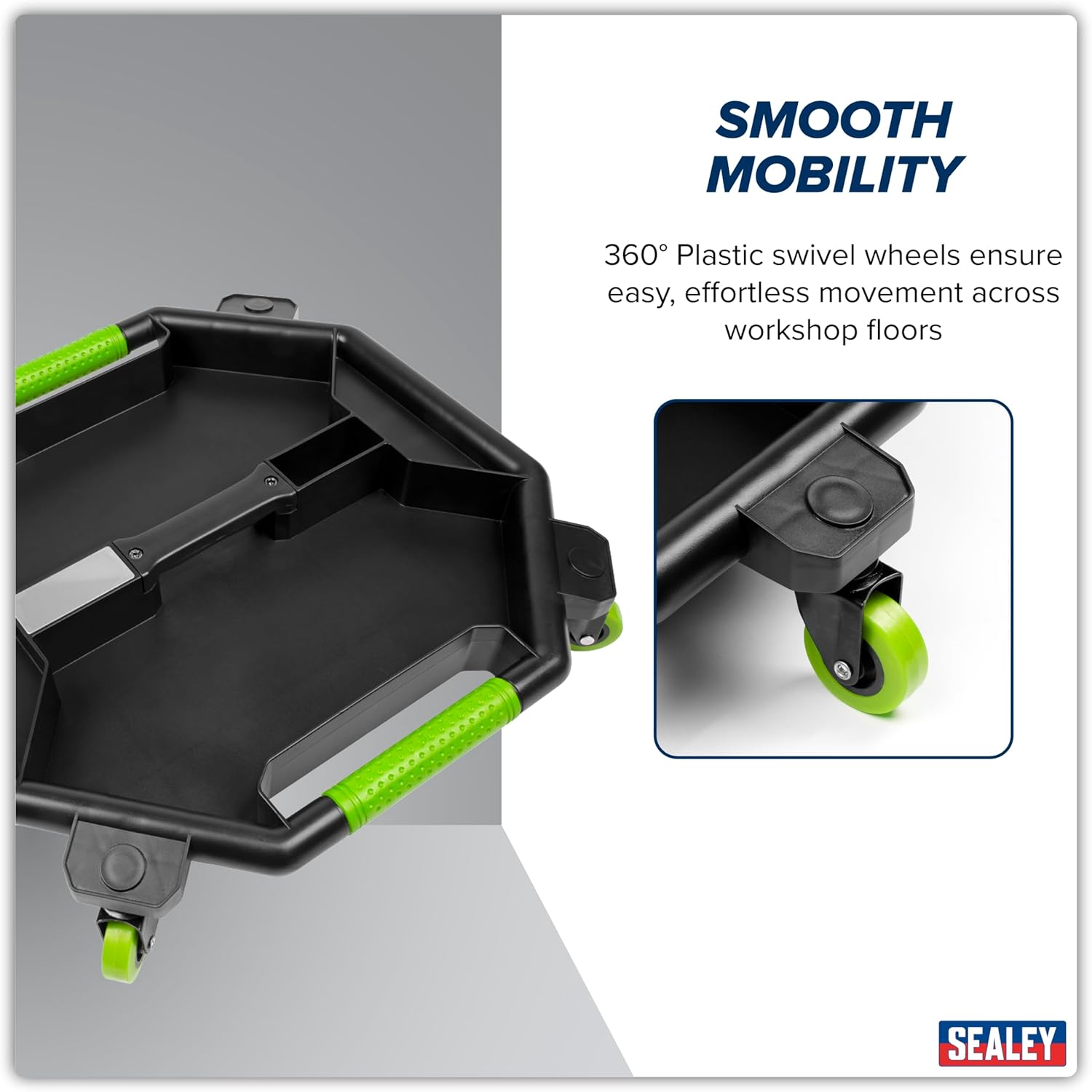 Creeper tool tray provides convenient organisation to help you work more efficiently. Features five compartments to hold and organise your tools and fasteners. Two large 5cm deep 39 x 16cm compartments, two 2.5cm deep 18 x 5cm compartments and a 5cm deep 8 x 4cm compartment. 360° Plastic swivel wheels are durable and smooth over workshop floors. Features metal plate to attach magnetic worklight.